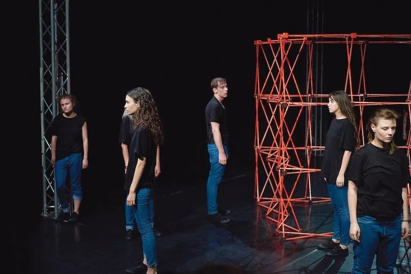 Ioana Păun: Sunt două foarte importante, faptul că sunt mulți tineri pe scenă, care performează și care degajă un anumit tip de energie pe care nu poți să îl obții decât prin prezența a foarte mulți oameni, că simți că e despre o generație și am ținut foarte mult la ei și a fost dificil să îi aducem pe toți la repetiții, dar e o componentă ultra importantă, că simți cumva ceva ce nu poți să reconstitui sau să sugerezi prin alte forme și ei chiar trăiesc și li se întâmplă multe chestii. Spectacolul începe cu ei și au un moment în care fac un pogo de