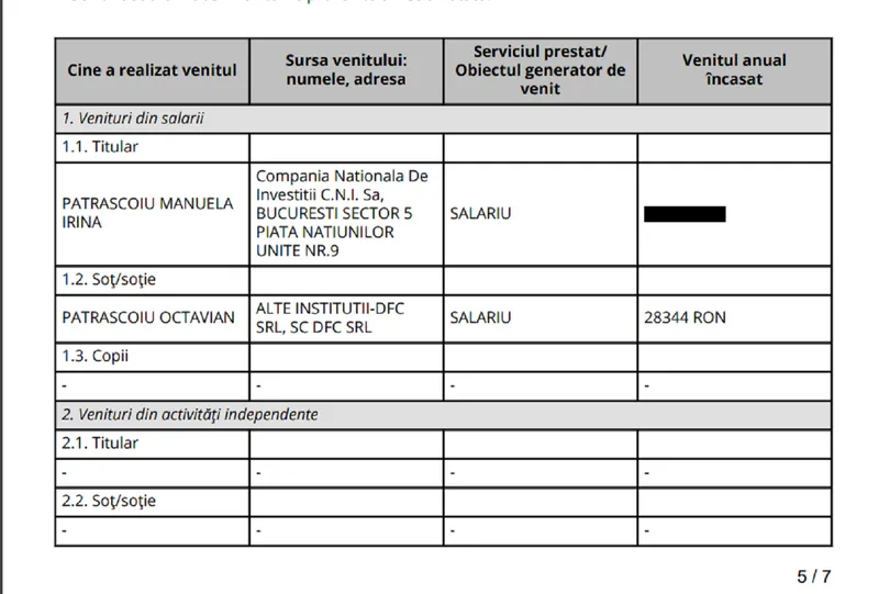 În declarația de avere din anul 2024, Pătrășcoiu nu trece nimic la rubrica „salariu” de la Compania Națională de Investiții.
