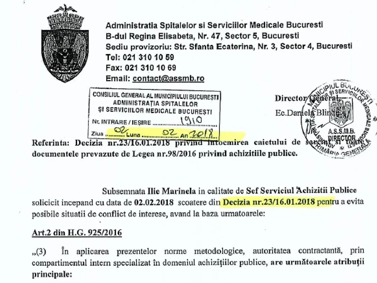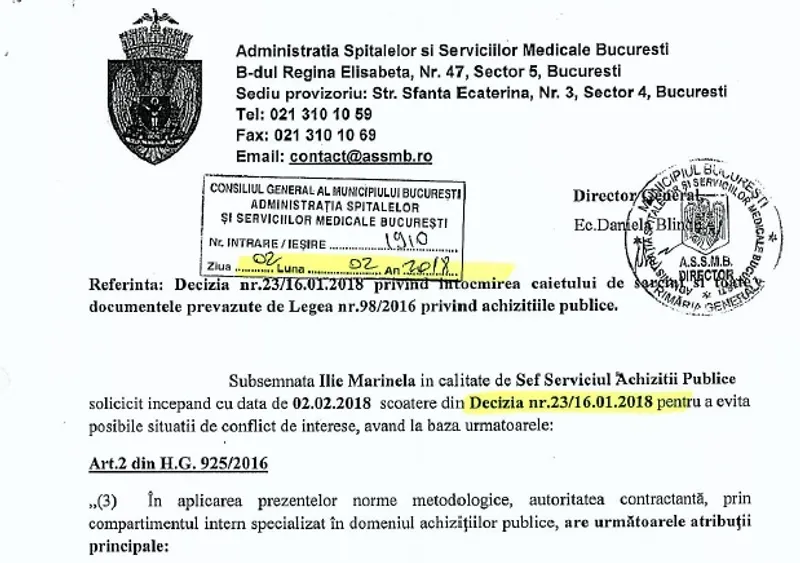 Pe 2 februarie 2018 s-a petrecut un lucru cel puțin bizar. Marinela Ilie, șefa Serviciului Achiziții Publice a ASSMB, a solicitat scoaterea din grupul de lucru care a întocmit caietul de sarcini, pe motiv că vrea să evite o posibilă situație de conflict de interese.