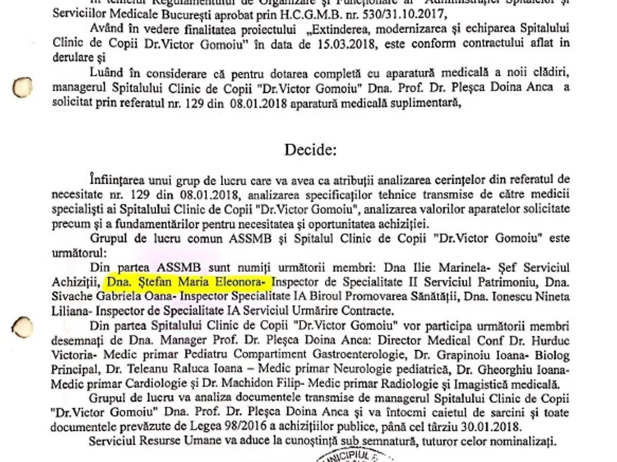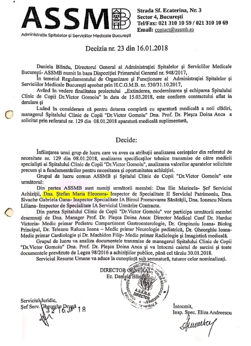După doar câteva săptămâni, pe 16 ianuarie 2018, prin decizia nr. 23, directoarea generală a ASSMB, Daniela Blându, decide înființarea unui grup de lucru care să analizeze oportunitatea unor achiziții pentru Spitalul clinic de copii „Dr. Vctor Gomoiu”, împreună cu medicii de la această unitate spitalicească. Echipamentele sunt menționate în referatul de necesitate nr. 129/8.01.2018.