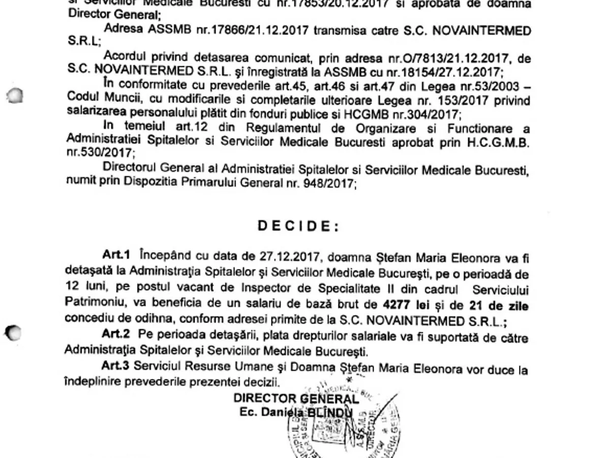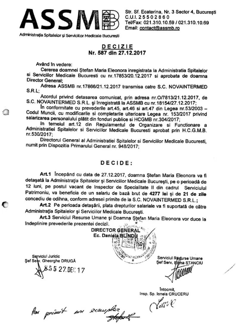 Pe 27 decembrie 2017, în plin sezon al Sărbătorilor de iarnă, o angajată a acestei firme, Eleonora Maria Ștefan, a fost detașată la Administrația Spitalelor și Serviciilor Medicale București (ASSMB), structură din subordinea Primăriei Capitalei conduse de Gabriela Firea, în baza deciziei ASSMB nr 587 (vezi facsimil).