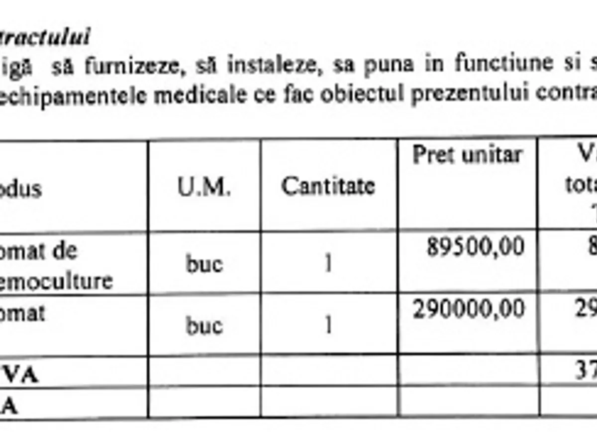 - 1 analizor automat de bacteriologie pentru hemocultură la prețul de 89.500 de lei, plus TVA de 17.005 lei,