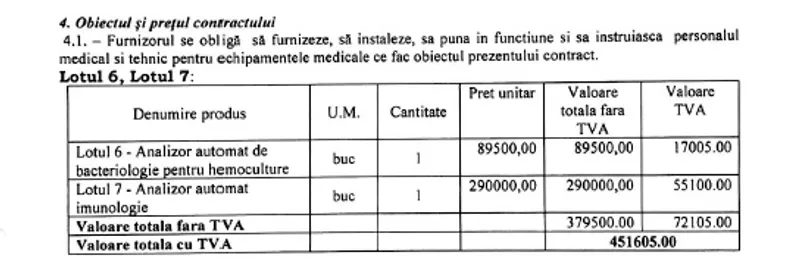 - 1 analizor automat imunologie la prețul de 290.000 de lei, plus TVA de 55.100 de lei.