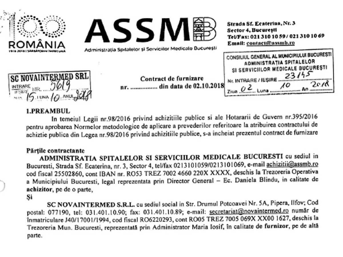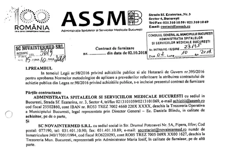 Pe 2 octombrie 2018, cu trei luni înainte să expire detașarea Eleonorei Maria Ștefan, ASSMB a semnat cu SC NOVAINTERMED SRL un contract de achiziții în valoare de peste 450.000 de lei (aproximativ 100.000 de euro). Obiectul contractului a fost livrarea, până la 31 decembrie 2018, către Spitalul Clinic de Copii „Dr. Victor Gomoiu” a următoarelor echipamente medicale: