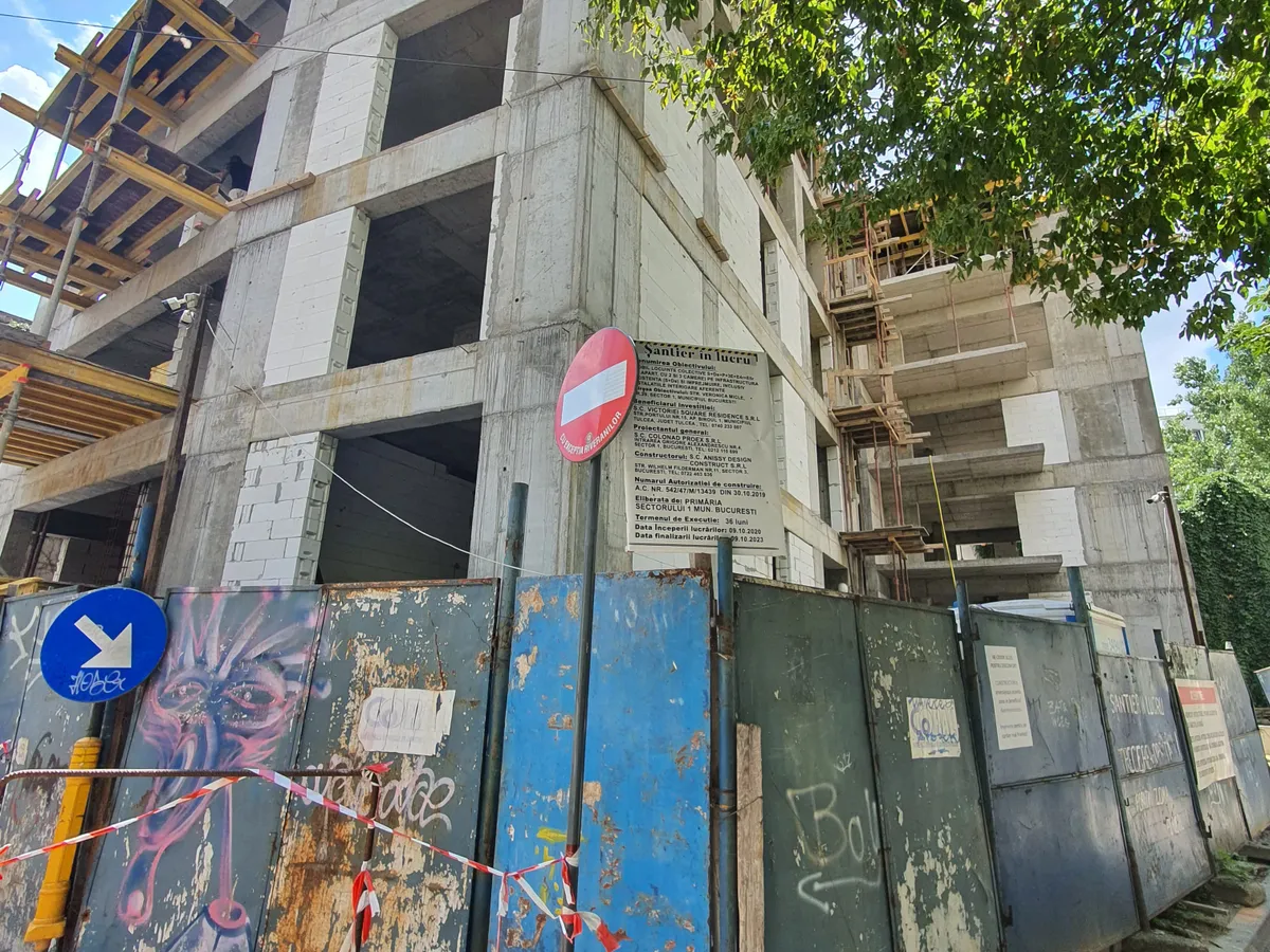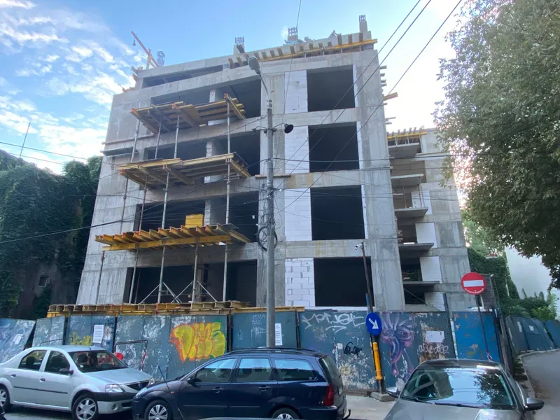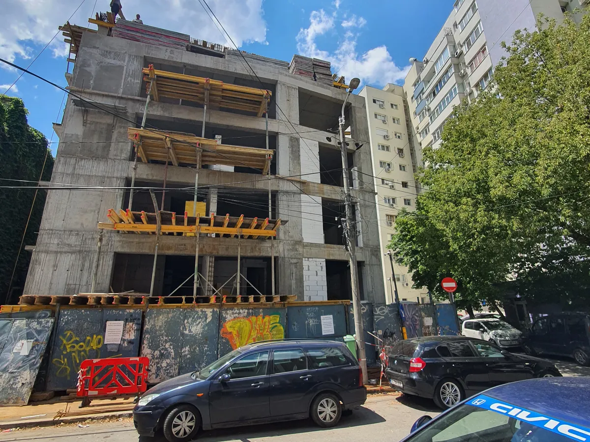 Camioanele care vin să descarce aici materiale de construcții blochează îngusta stradă Veronica Micle, iar muncitorii își strigă unul altuia comenzi de la etajele blocului care se construiește. Forfota a reapărut după ce fundația fusese abandonată aproape doi ani.