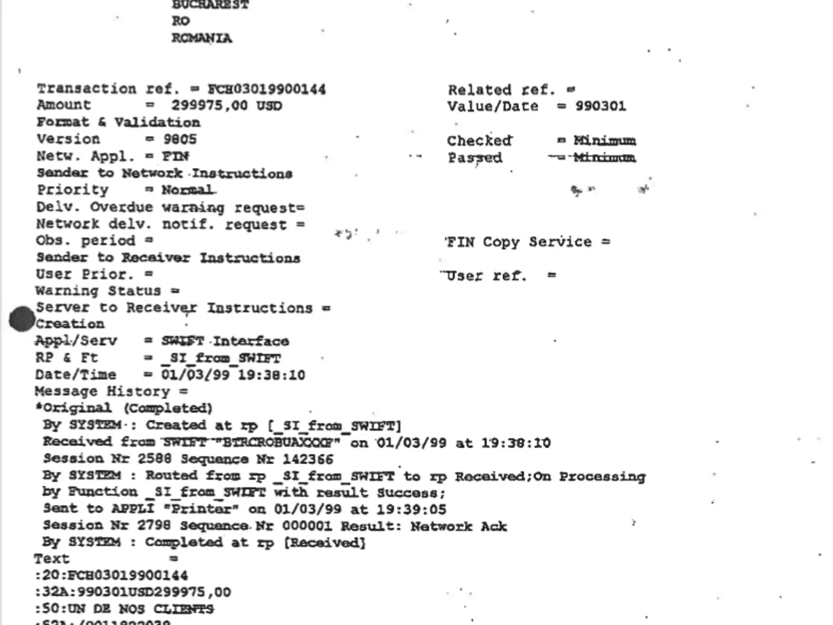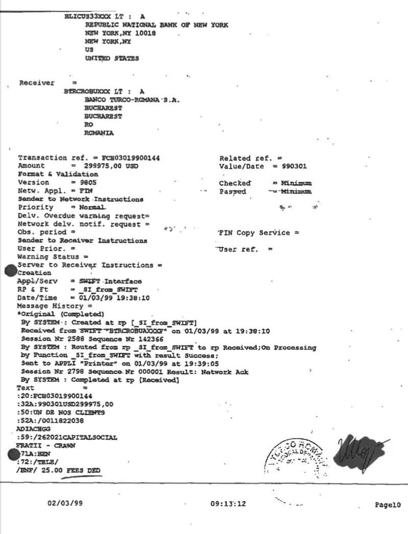 Transferul de 300.000 USD de la New York la București pentru firma lui Kassim Tajideen în martie 1999/FOTO: CRJI