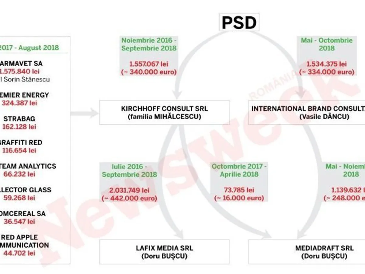 Cea de-a doua sursă generoasă de venit pentru Bușcu, firma International Brand Consultants SRL, a încasat de la PSD, în perioada mai-octombrie 2018, suma totală de 1.534.375 de lei, adică aproximativ 334.000 de euro.
