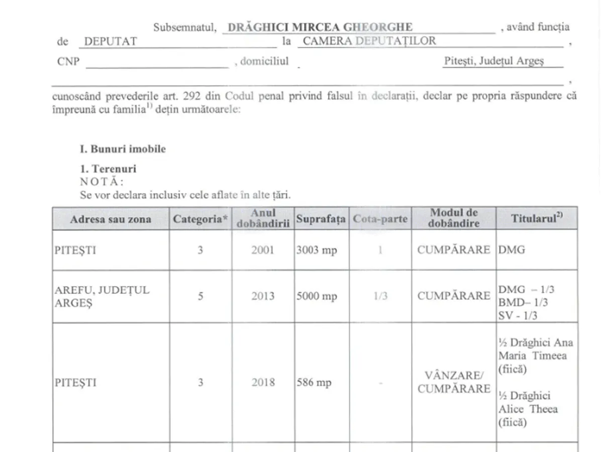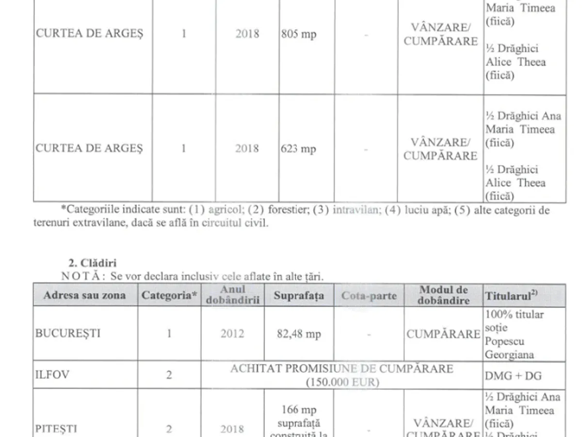 Patru luni mai târziu, adică acum două săptămâni, Drăghici a completat o nouă declarație de avere în care declară că a cumpărat pe numele fiicelor sale un teren de 586 mp în Pitești, un teren de 17.466 mp în comuna Oarja, din Argeș, plus alte trei terenuri în Curtea de Argeș.