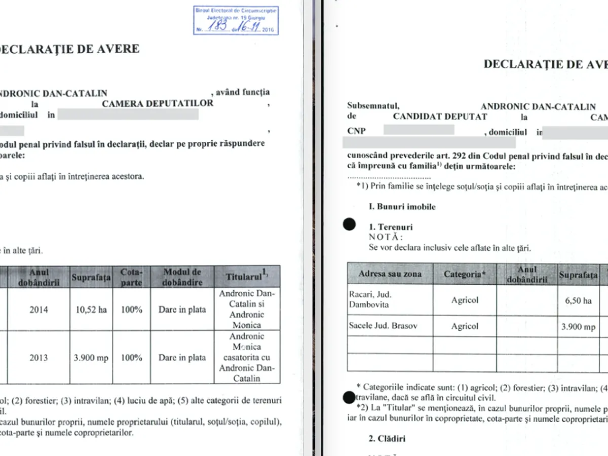 Cu acea ocazie, a completat declarații de avere. Două, la diferență de aproape trei săptămâni: prima, pe 26 octombrie 2016, a doua - pe 16 noiembrie 2016. În nici trei săptămâni, averea lui Dan Andronic s-a modificat substanțial la aproape toate capitolele. În plus.