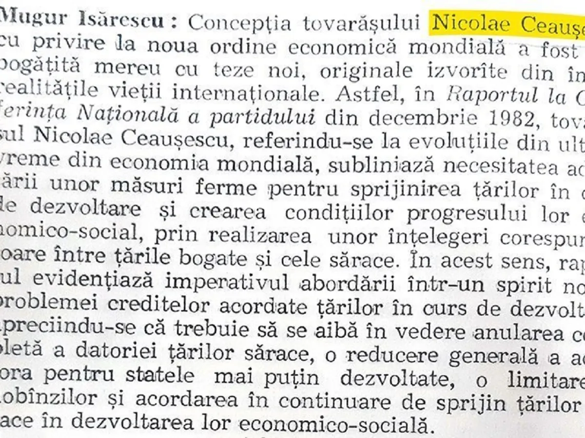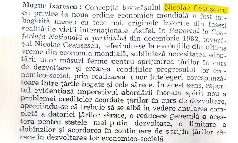 „Concepția tovarășului Nicolae Ceaușescu cu privire la noua ordine mondială a fost îmbogățită cu teze noi, originale, izvorâte din însăși realitatea vieții internaționale. Astfel, în Raportul la Conferința Națională a Partidului Comunist Român, din decembrie 1982, tovarășul Nicolae Ceaușescu, referindu-se la evoluțiile din ultima vreme din economia mondială, subliniază necesitatea adoptării unor măsuri ferme pentru sprijinirea țărilor în curs de dezvoltare și crearea condițiilor dezvoltării progresului lor economic-social, prin realizarea unor înțelegeri corespunzătoare între țările sărace și cele bogate“, scria Isărescu.