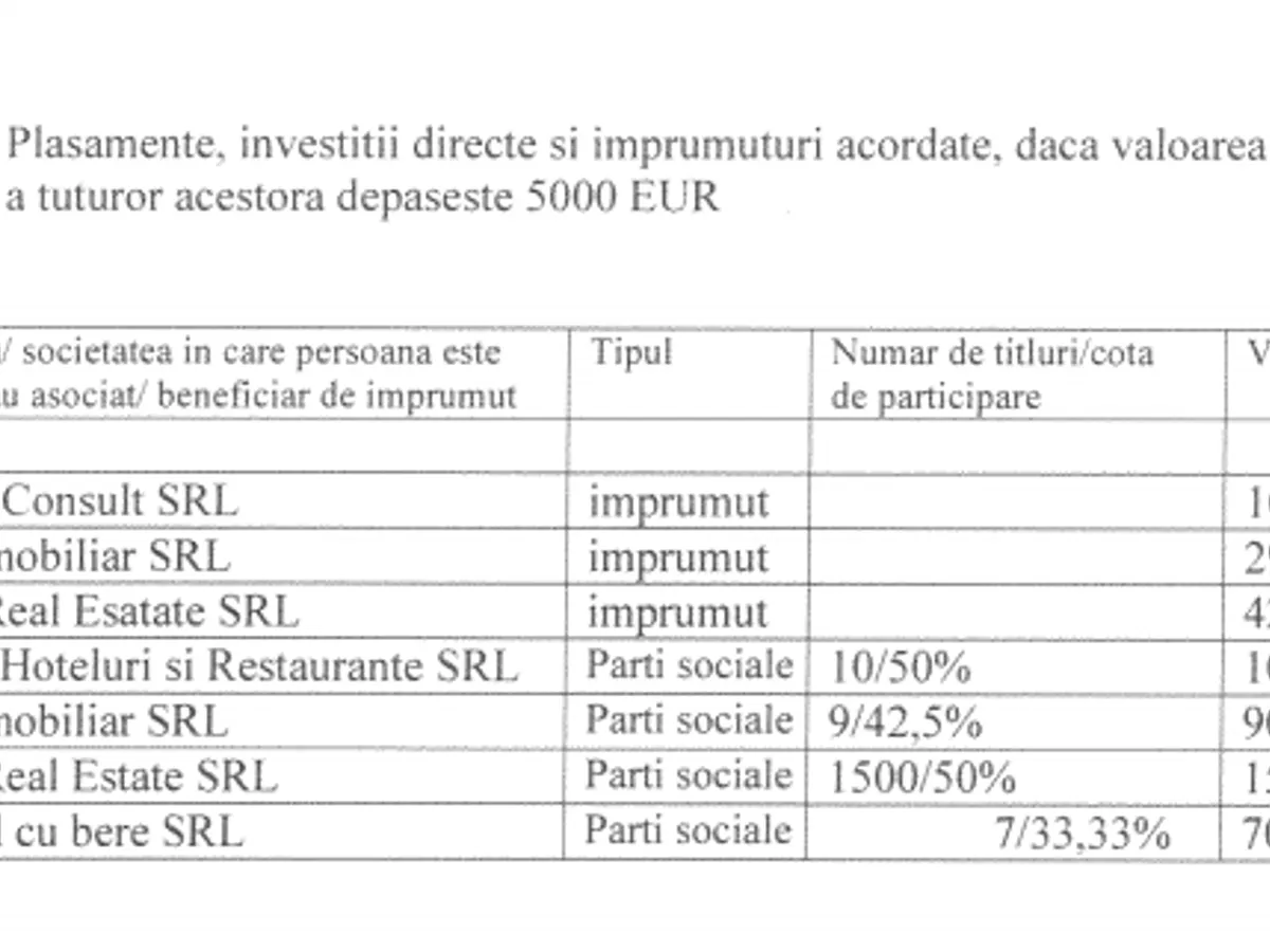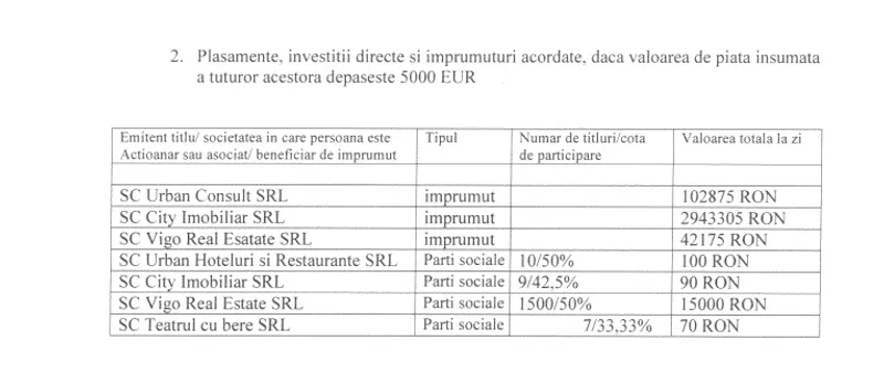Senatorul PSD a evitat să răspundă tranșant dacă-și va recupera banii din acea companie, în cazul declarării falimentului. Întrebat de unde a avut trei milioane de lei pentru a investi în companie, a invocat Agenția Națională de Integritate: "Totul a fost legal, am și fost verificat de ANI, la sesizarea unui coleg de partid, și am primit scrisoare acasă că nu am nici o problemă cu averea."