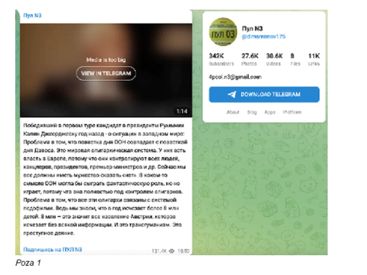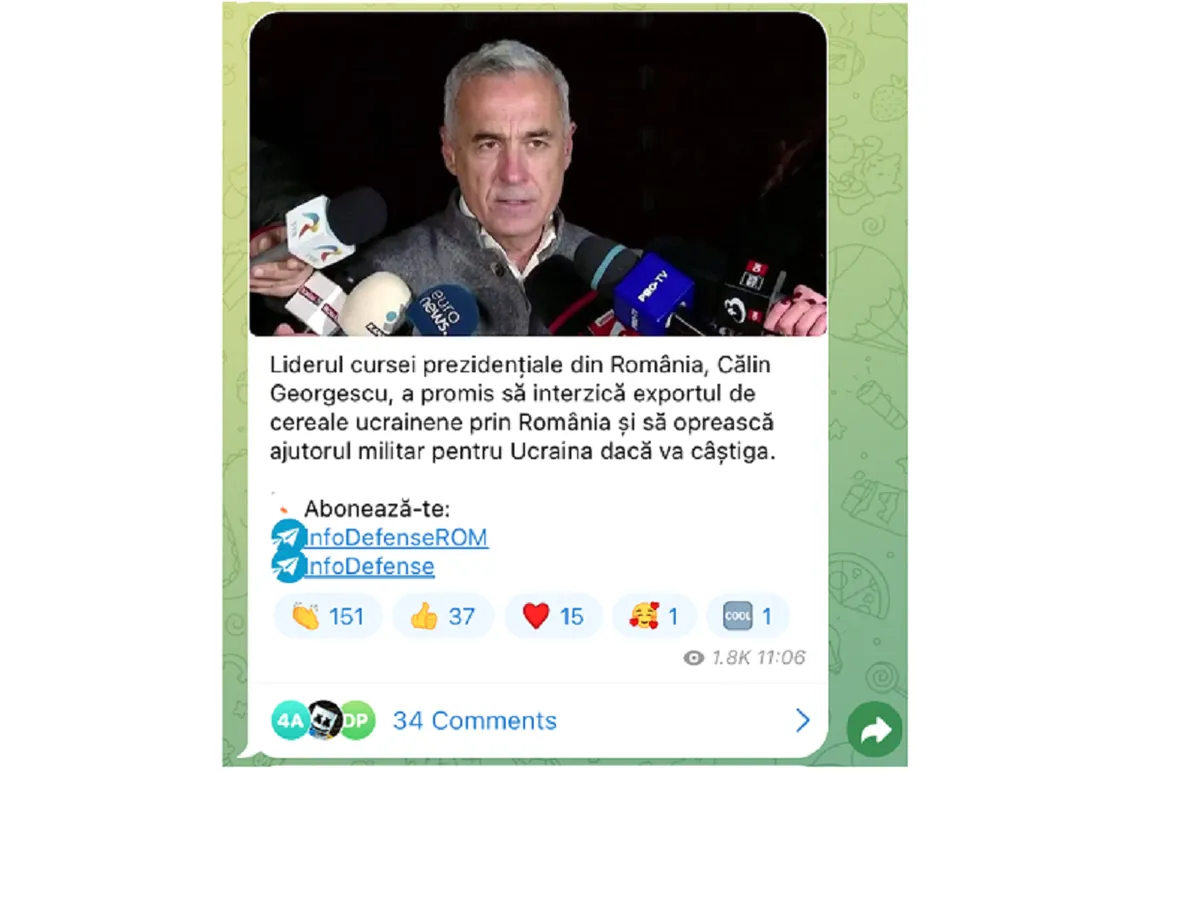 Canalul Telegram Пул N3 din Rusia deține o audiență semnificativă (342.000 urmăritori), mesajul cumulând peste 121.000 vizualizări. Captura redă o porțiune din interviul lui Georgescu din 2023, reiterând aceeași narativă conspiraționistă, de această dată în contextul alegerilor prezidențiale. Sputnik Moldova (media rusească) de asemenea redă mesaje similare, dacă nu identice, propagând tema candidatului „independent”, „suveranist”, „pacifist”, care va pune capăt tuturor conflictelor, cu o Românie, „nici în vest, nici în est”.