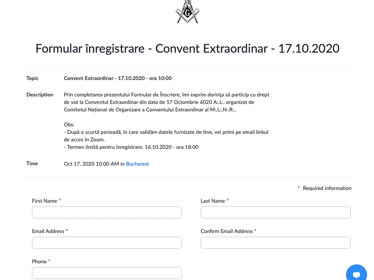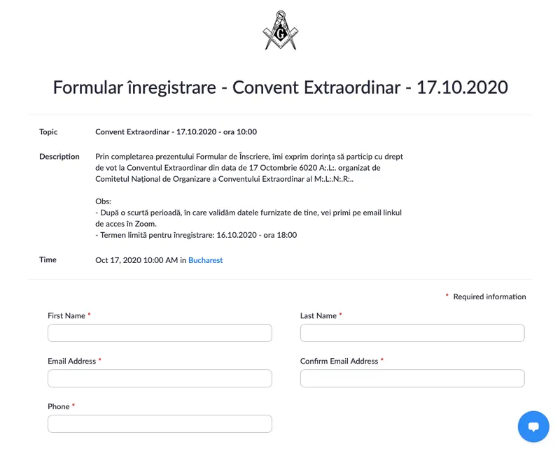 2. Te înregistrezi pe linkul de mai jos, unde te rugăm să scrii, pe lângă informațiile uzuale, numele și numărul de telefon ale unui Frate care te recunoaște ca Maestru Mason.