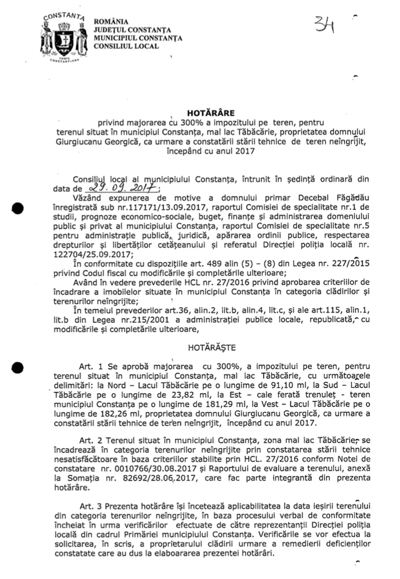 După ce Înalta Curtea i-a condamnat pe Giurgiucanu, Mazăre și restul, prin Consiliul Local Constanța a trecut o singurp hotărâre care ar putea avea legătură cu demersurile de recuperare a terenului. Este vorba de HCL 298 din iulie 2019, “HOTARARE DE CONSILIU PRIVIND APROBAREA UNOR PRECIZĂRI REFERITOARE LA APLICAREA PREVEDERILOR REGULAMENTULUI LOCAL DE URBANISM AFERENT PLANULUI URBANISTIC ZONAL APROBAT PRIN HCL 415/2003 - ACTUALIZARE PUZ (Plan de Urbanism Zonal – n.r.) LAC TĂBĂCĂRIE”, cum apare pe site-ul Primăriei. În mod ciudat, însă, titlul HCL nu trimite la nici un document, așadar este un mister ce conține.