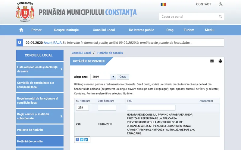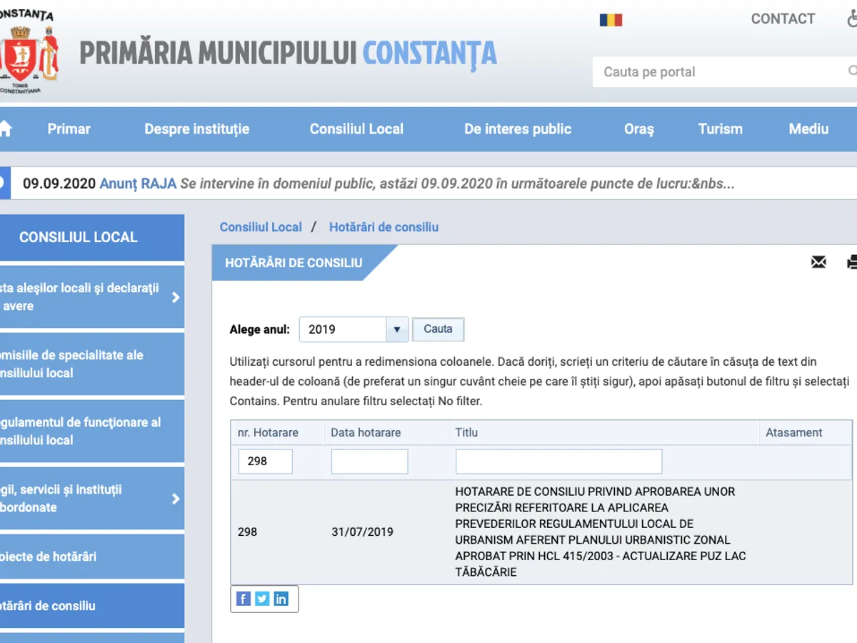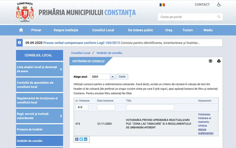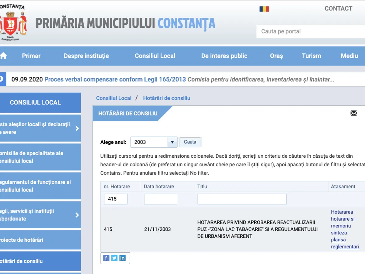 HCL 298/2019 trimite la HCL 415/2003 - PUZ-ul Lac Tăbăcărie, Hotărâre disponibilă pe site-ul Primăriei Constanța.