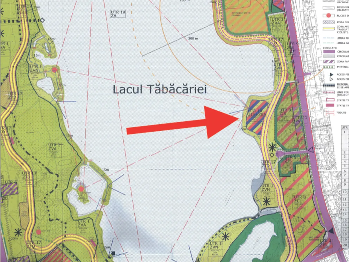 PUZ-ul Lac Tăbăcărie din 2003. Săgeata roșie indică peninsula hașurată care este acum în proprietatea lui Goergică Giurgiucanu. FOTO: Primăria Constanța