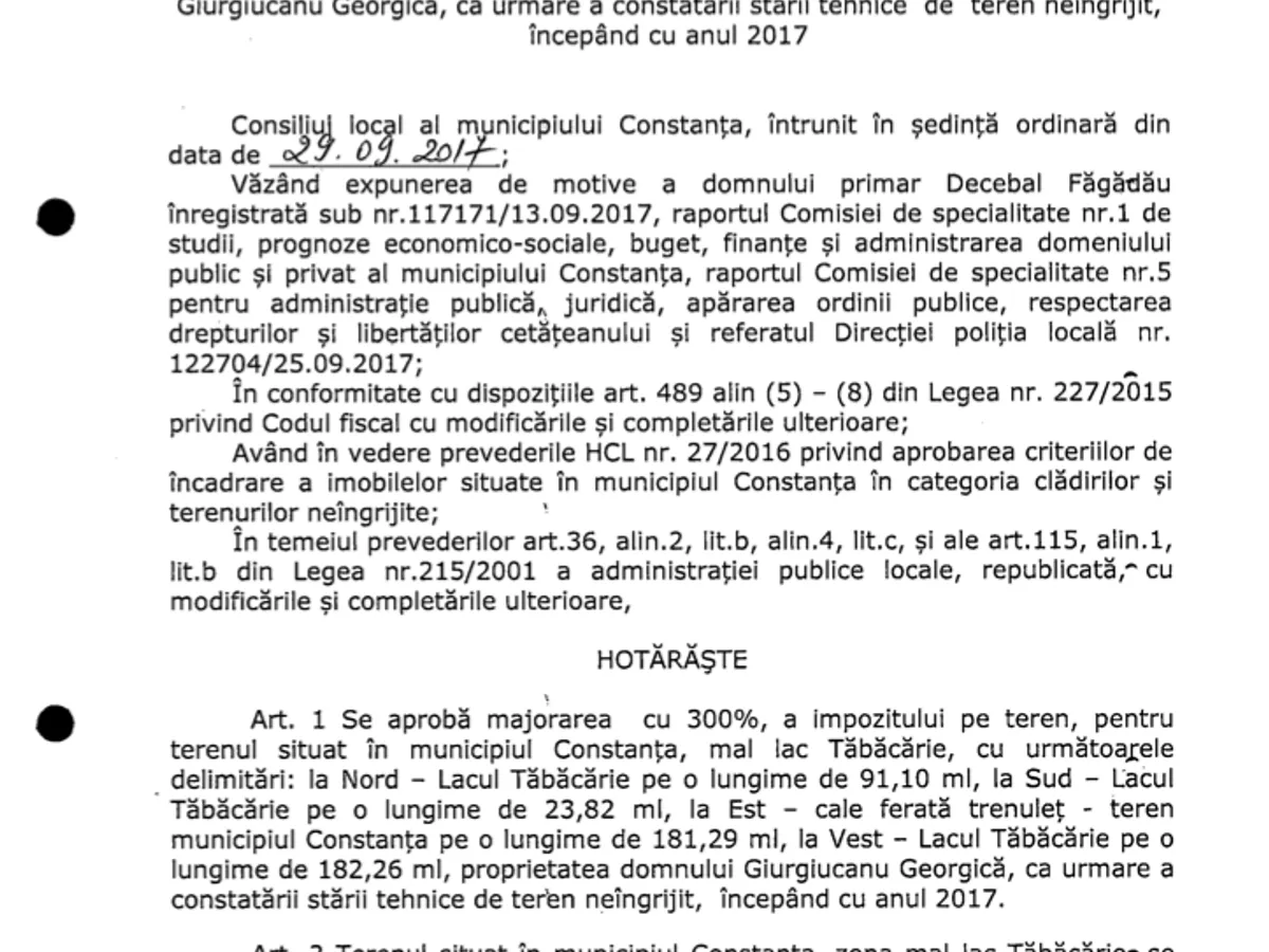 Că primarul Făgădău știe că terenul a ajuns un focar de infecție este dovedit de o HCL din 2017 prin care lui Giurgiucanu i s-a mărit impozitul pe teren cu 300% tocmai din acest motiv. După trei ani, însă, problema a rămas.