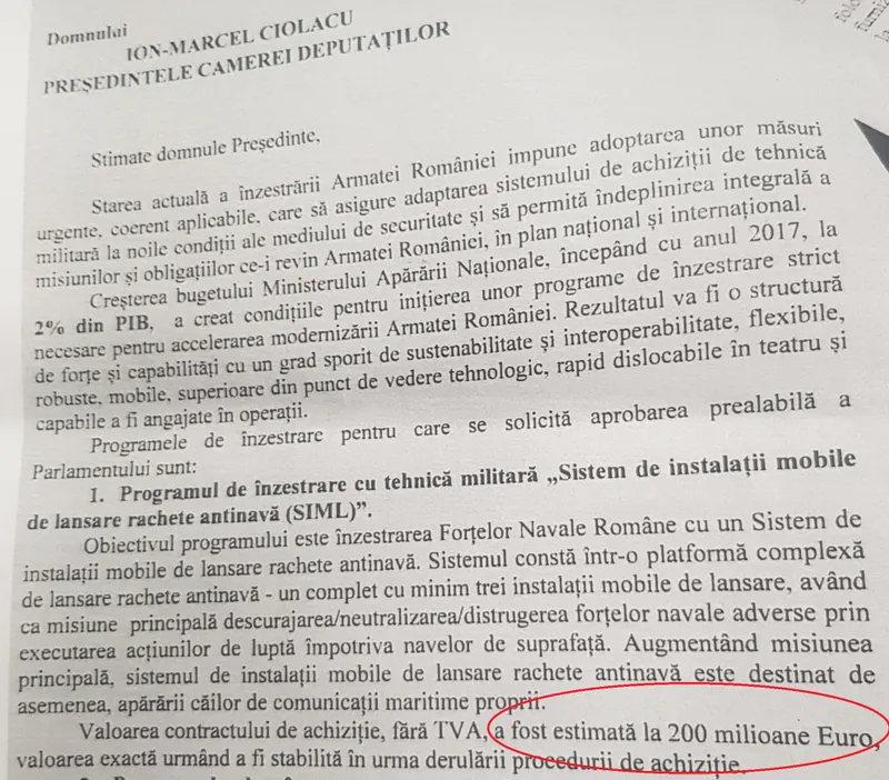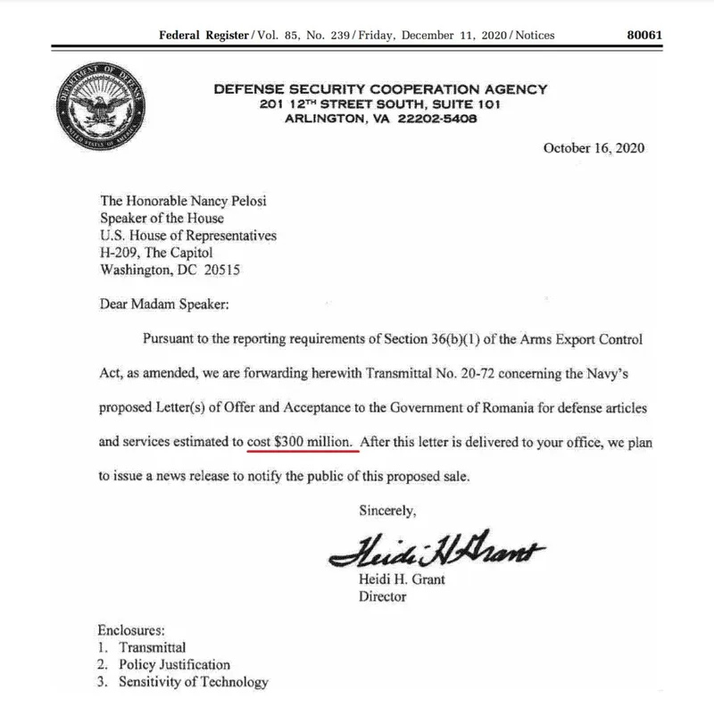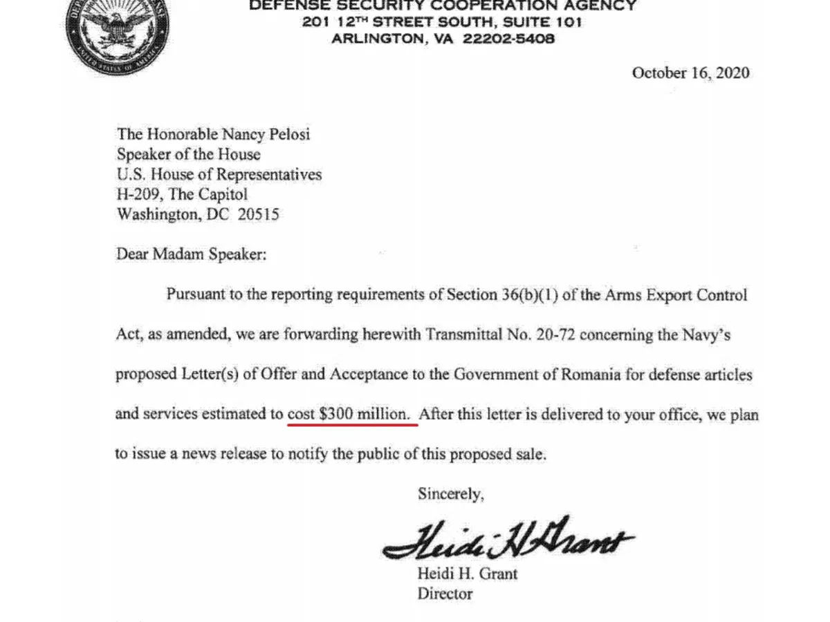 Din Registrul Federal al SUA aflăm că, de fapt, Guvernul României, respectiv Ministerul Apărării Naționale, au solicitat achiziția a două sisteme de rachete antinavă formate din patru instalații de lansare mobile, alte vehicule de transport, sisteme de comunicații și rachete. Valoarea contractului a fost estimată de americani la 300 de milioane dolari, nu la 200 de milioane euro, așa cum au estimat inițial oficialii ministerului conduși de generalul (r) Nicolae Ciucă, ministrul Apărării Naționale. Mai mult, în Registrul Federal se menționează faptul că contractul va fi atribuit companiei Raytheon și nu beneficiază de offset.