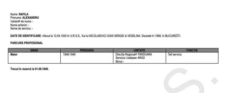 Conform CNSAS, a existat un ofițer de Securitate numit Alexandru Rafila care a condus Serviciul Securității Arad între 1948 și 1949.
