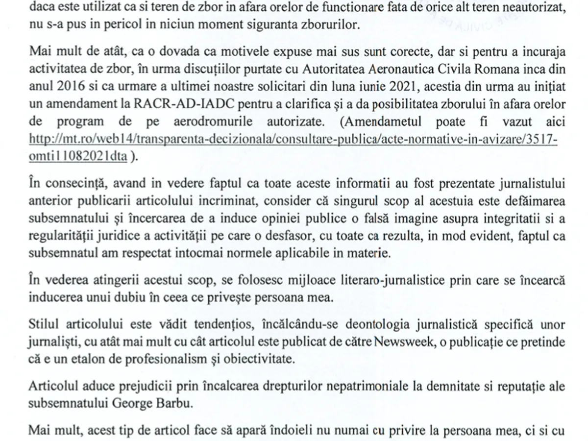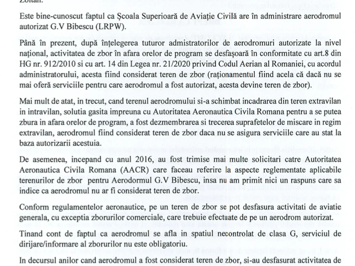 „Ținând cont de cele expuse mai sus, dar și de faptul că un aerodrom autorizat este mult mai sigur dacă este utilizat ca și teren de zbor în afara orelor de funcționare față de orice alt teren neautorizat, nu s-a pus în pericol în niciun moment siguranța zborurilor“, a declarat George Barbu.