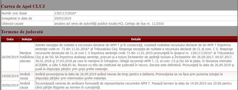 Ulterior, decizia a fost atacată la Curtea de Apel Cluj de către Deva Gold și Consiliul Local al comunei Certej, emitentul documentelor. Nici de această dată cu sorți de izbândă, pentru că documentele au fost emise ilegal.