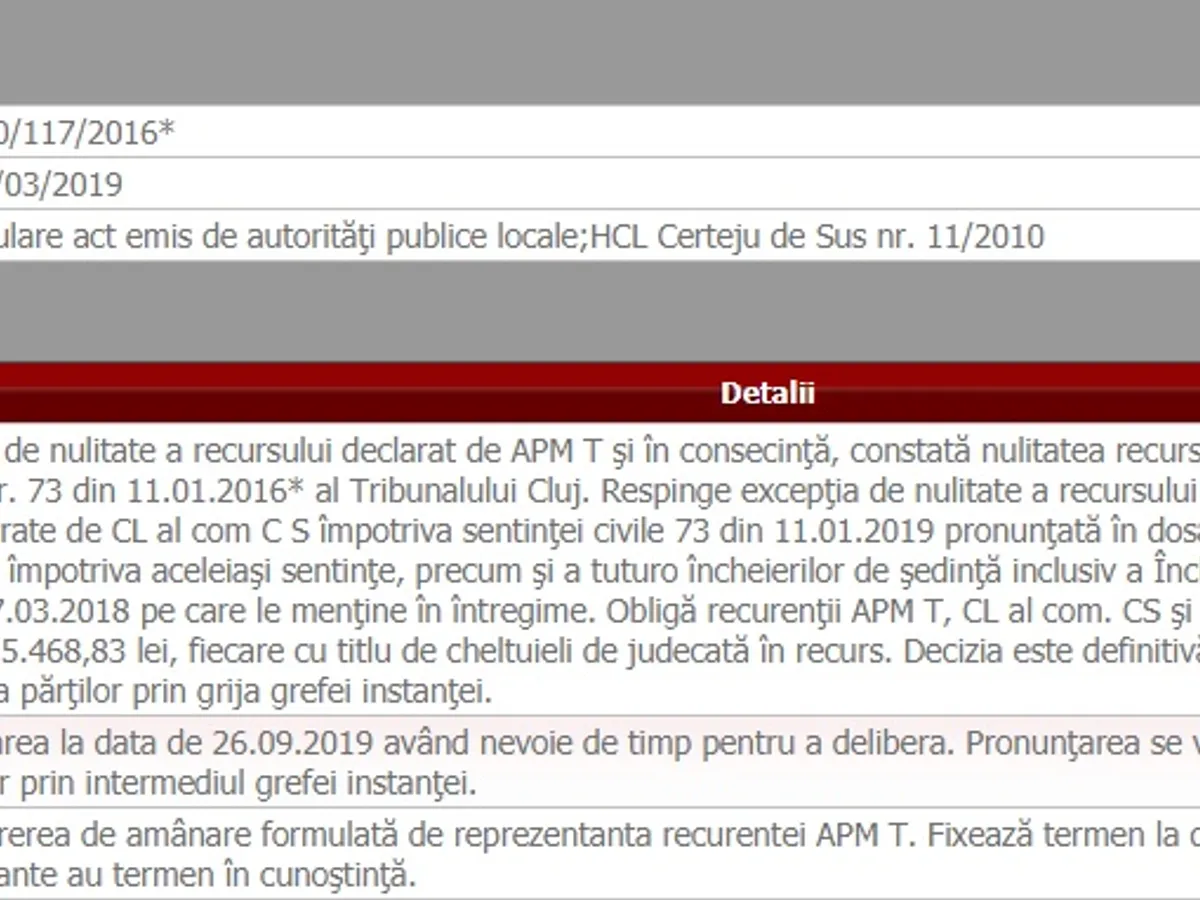 În cursul acestei zile, Curtea de Apel Cluj a decis să respingă recursurile formulate de compania Deva Gold și Consiliul Local al comunei Certej. Definitiv și irevocabil. Mai mult, judecătorii au decis ca cele două entități să plătească fiecare câte 5.468,83 lei, cu titlu de cheltuieli de judecată în recurs.