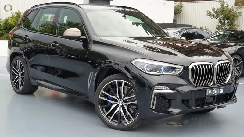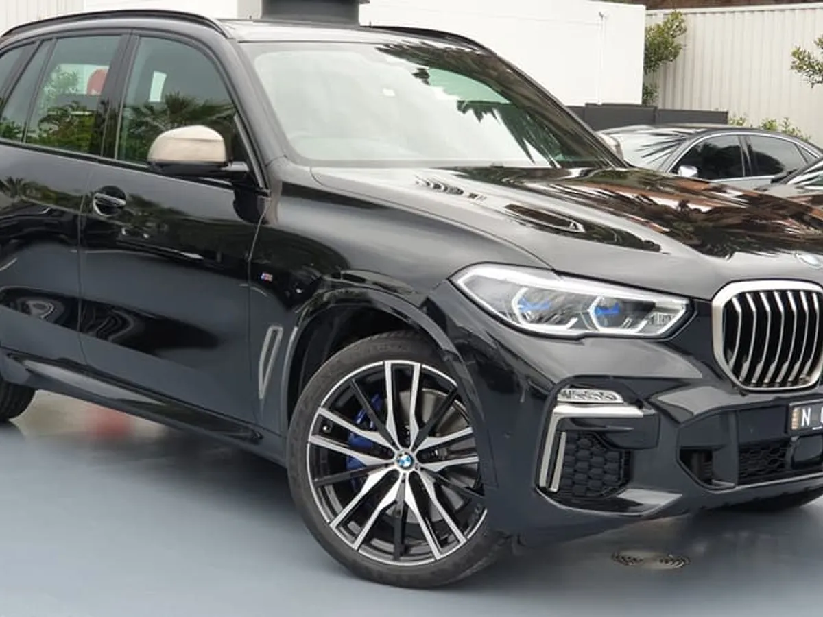 BMW X5 M50i este model G05, culoare BLACK SAPPHIRE METALLIC, produs în august 2019, are motor 4.4 litri, 530 CP și un preț de bază de circa 115.000 euro, fără opțiuni.