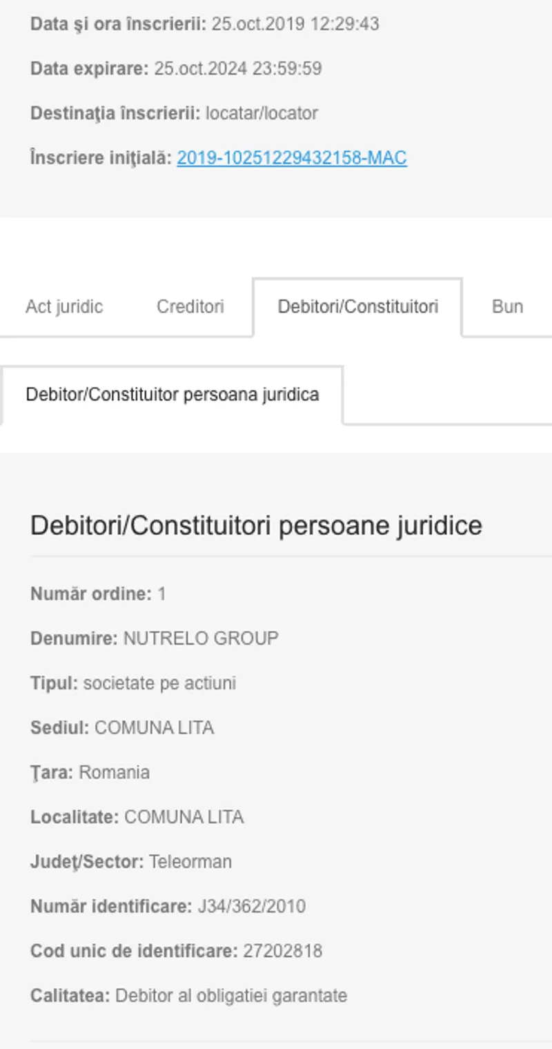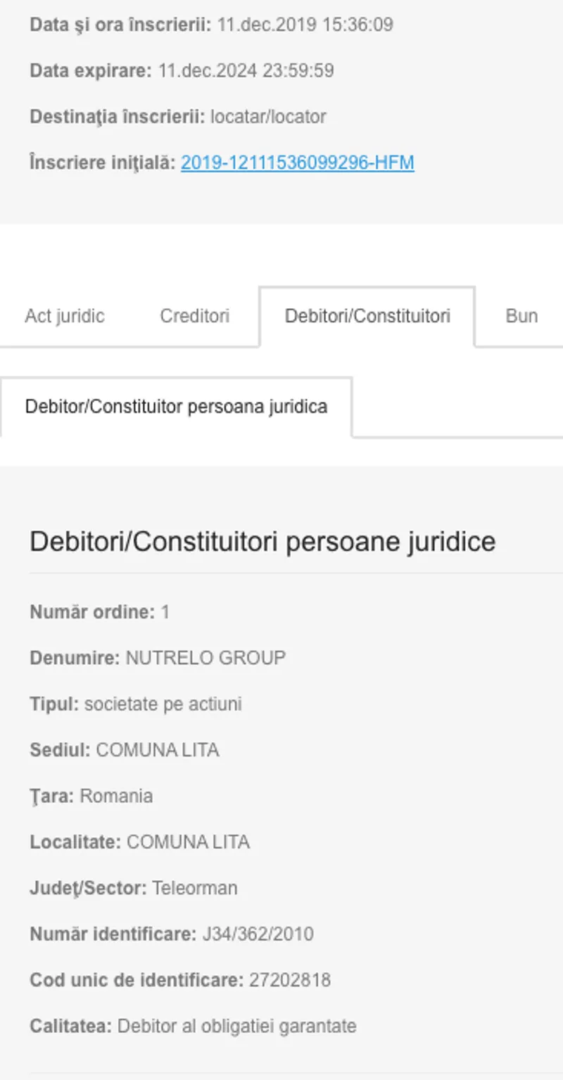 Pe 25 octombrie 2019, Nutrelo Group SA a luat în leasing un Mercedes S, după cum arată documentele de la Registrul Național de Publicitate Mobiliară.