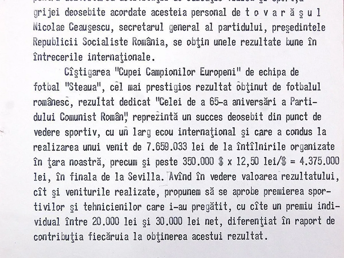 Newsweek România prezintă documentul cu sumele pe care jucătătorii Stelei le-au primit după triumful din finala Cupei Campionilor Europeni de la Sevilia, dar și suma uriașă câștigată de Partidul Comunist de pe urma acestei performanțe.
