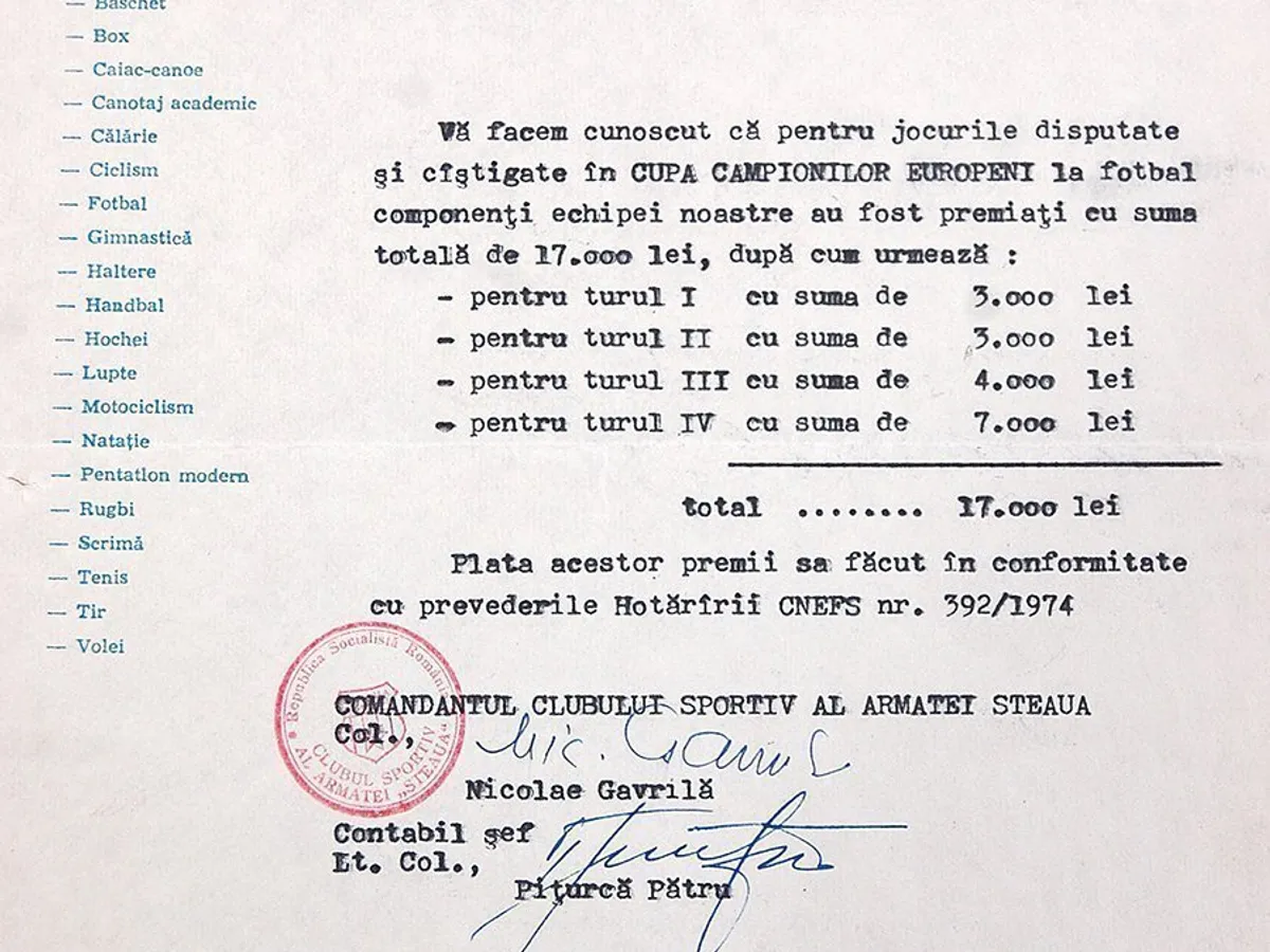 „Vă facem cunoscut că, pentru jocurile disputate și câștigate în Cupa Campionilor Europeni la fotbal, componenții echipei noastre au fost premiați cu suma totală de 17.000 de lei după cum urmează: