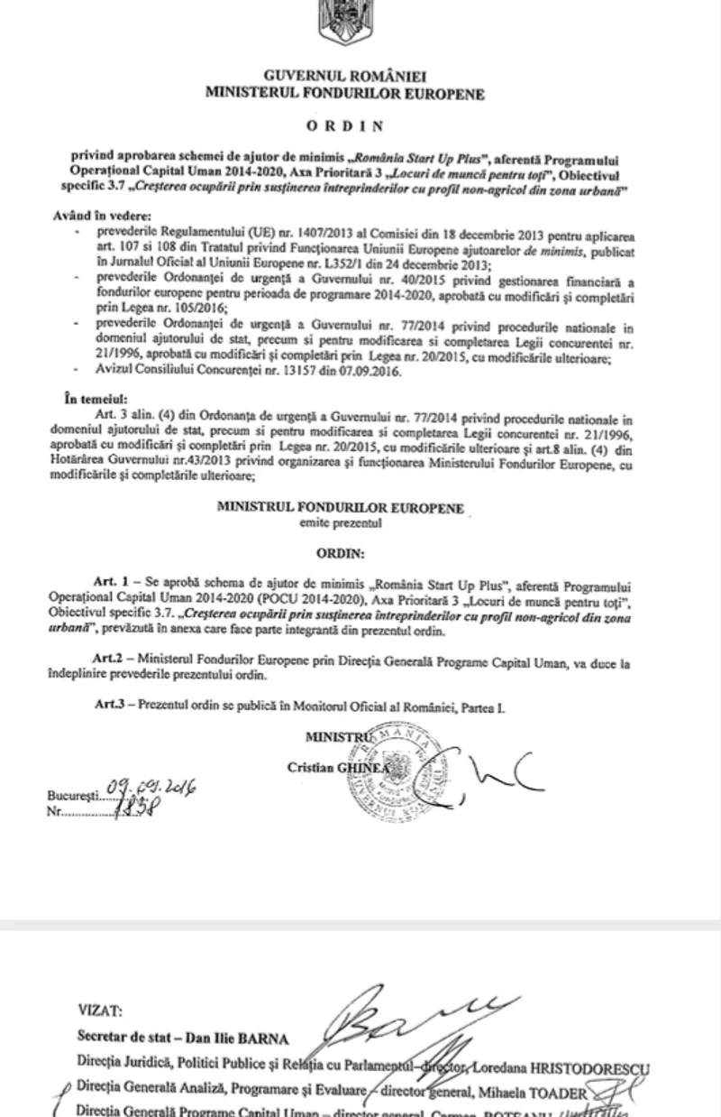 Dar asta nu e tot: Dan Barna a semnat și el un ordin al ministrului Cristian Ghinea, în calitate de secretar de stat. Și nu orice ordin: ci cel cu numărul 1838, prin care se aprobau banii pentru proiecte. Sau, în limbaj birocratic, "schema de ajutor de minimis". Astfel, ordinul 1838, semnat de ministrul Ghinea, este vizat de către secretarul de stat Dan Barna, cu prima semnătură sub cea a fostului și actualului ministru de la Fonduri Europene.