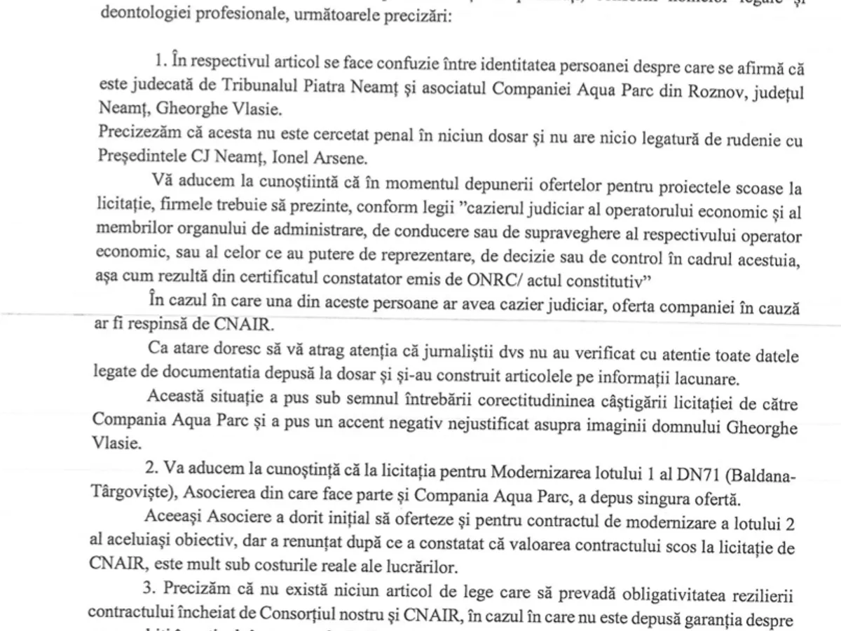 Gheorghe Vlasie, actualul patronul al firmei Aqua Parc, susține într-un drept la replică trimis Newsweek România că CNAIR s-a grăbit să anunțe rezilierea contractului de 120 de milioane euro pentru că nu a depus garanția de bună execuție în termen de cinci zile lucrătoare. Motiv pentru care se fac diligențe pentru depunerea garanției de bună execuție.