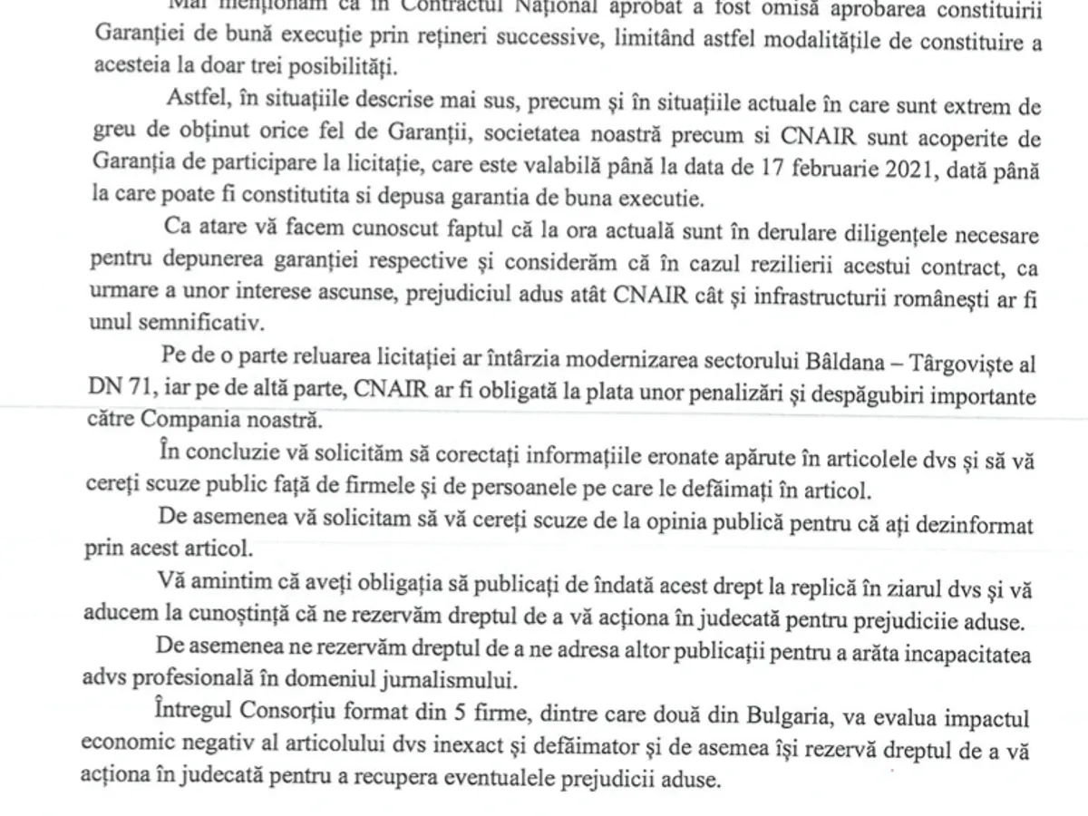 „Astfel, în situațiile descrise mai sus, precum și în situațiile actuale în care sunt extrem de greu de obținut orice fel de Garanții, societatea noastră precum și CNAIR sunt acoperite de Garanția de participare la licitație, care este valabilă până pe 17 februarie 2021, dată până la care poate fi constituită și depusă garanți de bună execuție. Ca atare vă facem cunoscut faptul că la ora actuală sunt în derulare diligențele necesare pentru depunerea garanției respective și considerăm că în cazul rezilierii acestui contract, ca urmare a unor interese ascunse, prejudiciul adus atât CNAIR cât și infrastructurii românești ar fi unul semnificativ”.
