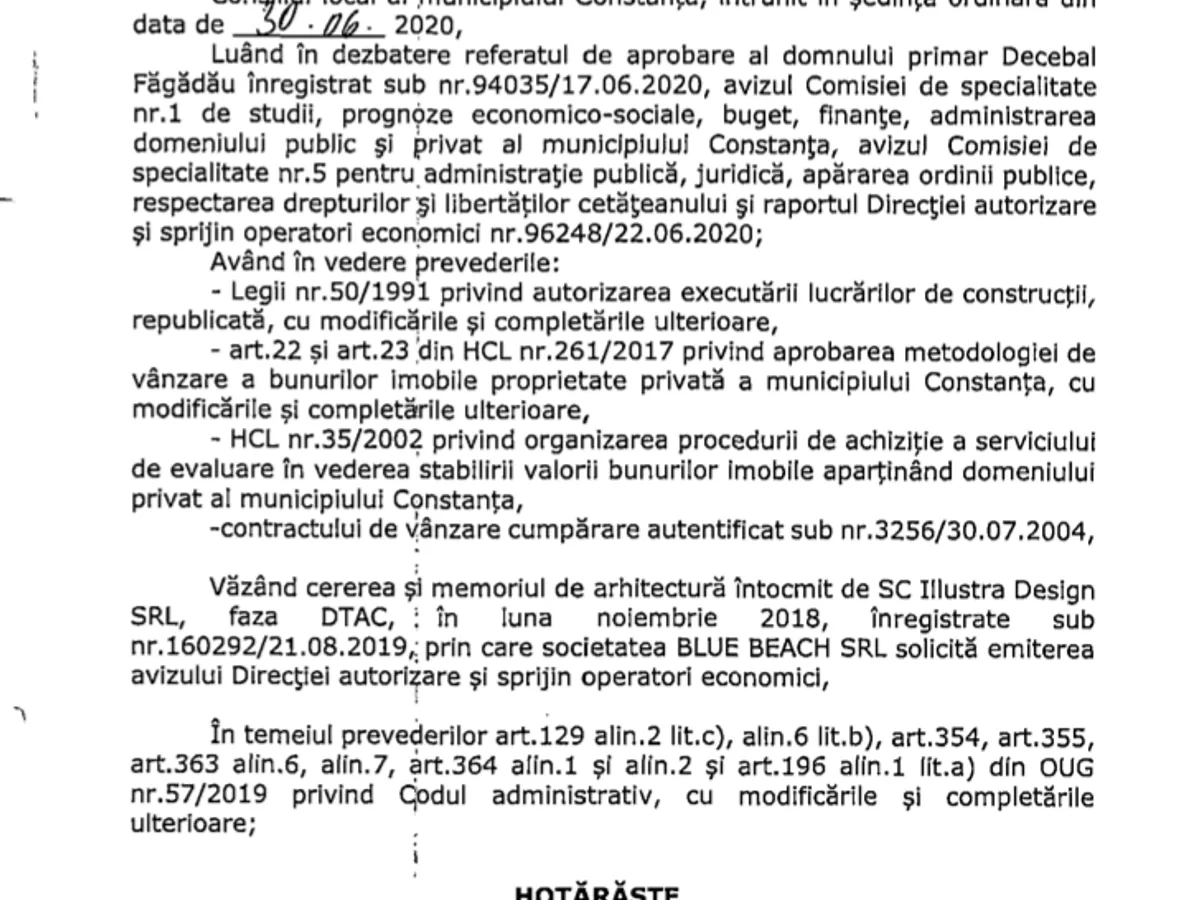 De la ce a plecat această Hotărâre de Consiliu Local? De la “cererea și memoriul de arhitectură întocmit de SC Illustra Design SRL, faza DTAC, în luna noiembrie 2018, înregistrate sub nr. 160292/21.08.2019, prin care societatea BLUE BEACH SRL solicită emiterea avizului Direcției autoritare și sprijin operatori economici”. Conform surselor din Consiliul Local, imediat ce acea cerere a fost înregistrată, primarul Decebal Făgădău a început demersurile de aprobare în CL. Nu a avut succes, însă, decât după aproape zece luni, la sfârșitul lui iunie a acestui an, când în Consiliul Local au fost puse “în dezbatere referatul de aprobare al domnului primar Decebal Făgădău înregistrat sub nr. 94035/17.06.2020, avizul Comisiei de specialitate nr. l de studii, prognoze economico-sociale, buget, finanțe, administrarea domeniului public și privat al municipiului Constanța, avizul Comisiei de specialitate nr. 5 pentru administrație publică, juridică, apărarea ordinii publice, respectarea drepturilor și libertăților cetățeanului și raportul Direcției autorizare și sprijin operatori economici nr. 96248/22.06.2020”.