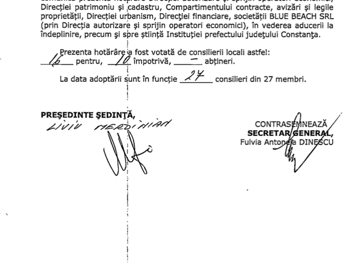 La vot, 16 din 27 de consilieri au votat favorabil (balanța, conform surselor locale, a fost înclinată de consilierii PMP), astfel că Blue Beach SRL și-a văzut cererea aprobată.