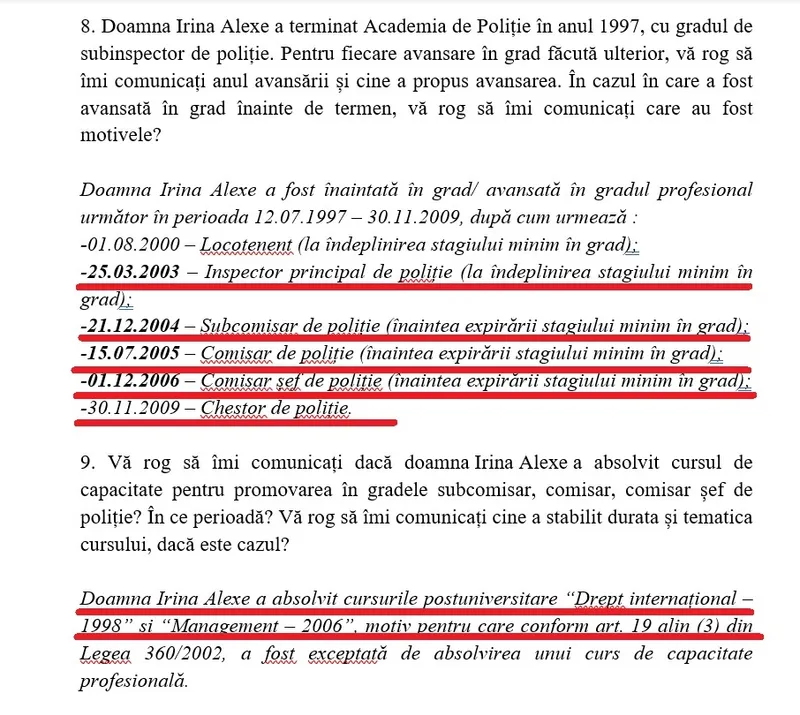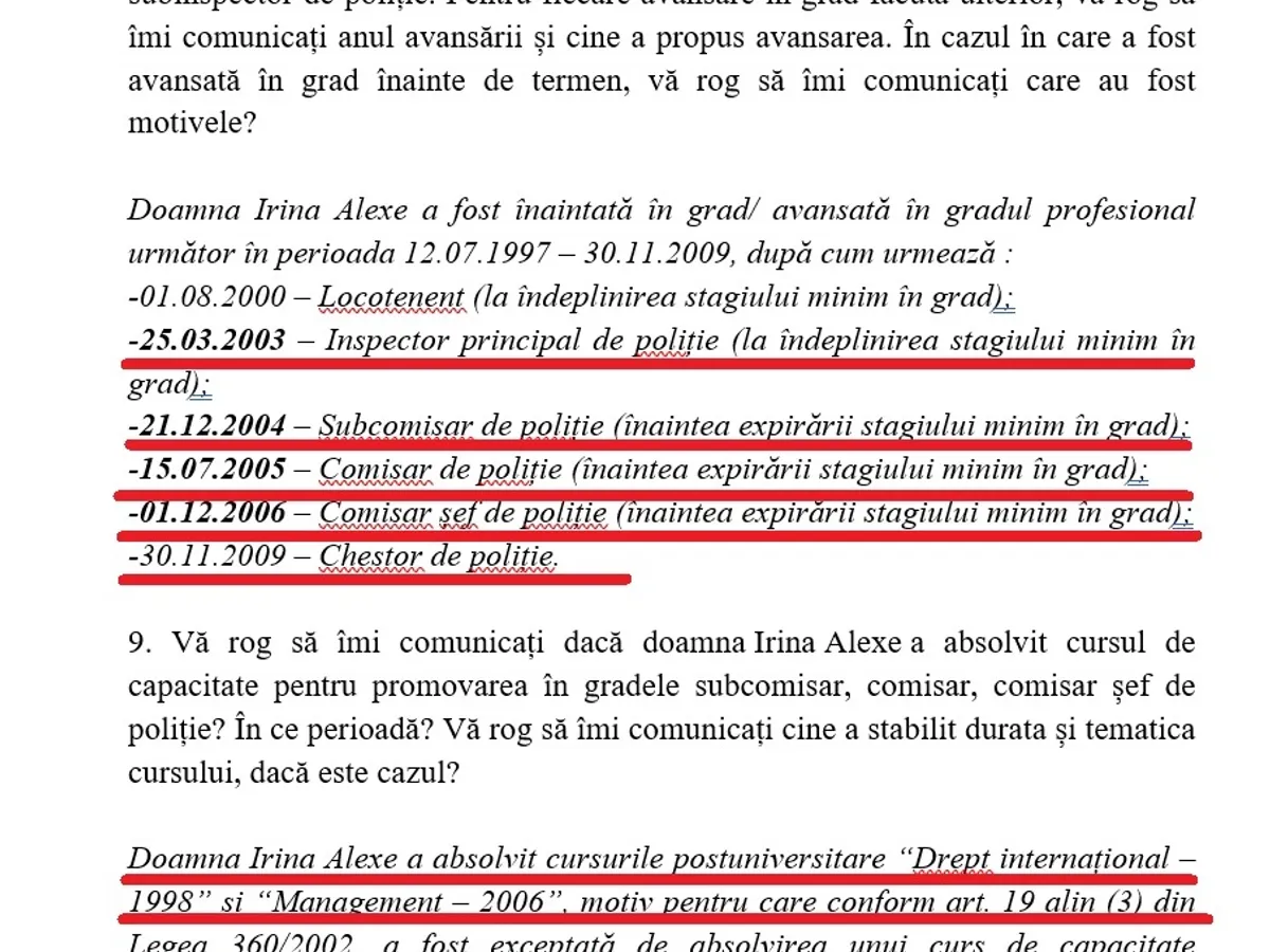 Conform unui răspuns transmis de Direcția de Comunicare a MAI, avansarea în gradul de subcomisar de poliție s-a făcut „înaintea expirării stagiului minim în grad”. Un calcul simplu arată că Irina Alexe putea fi avansată în acest grad de abia pe 25 martie 2006.