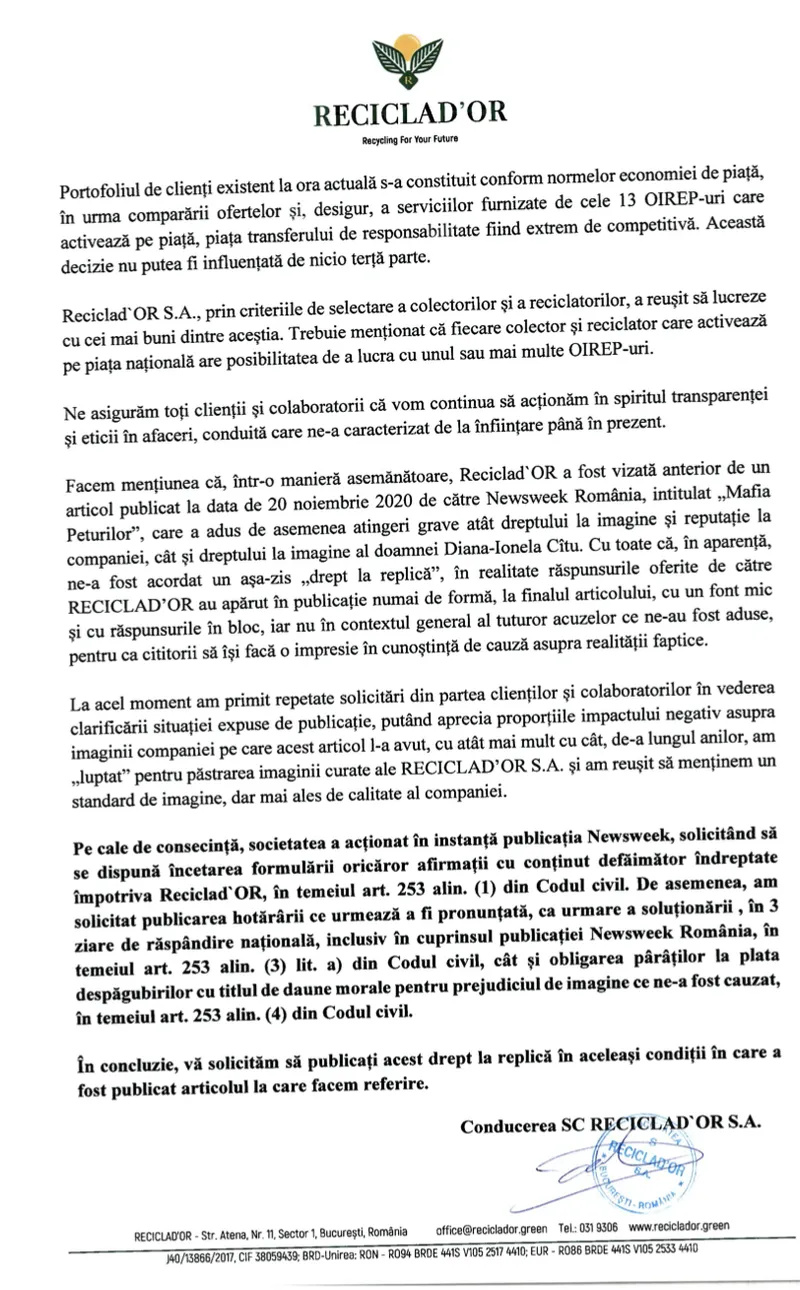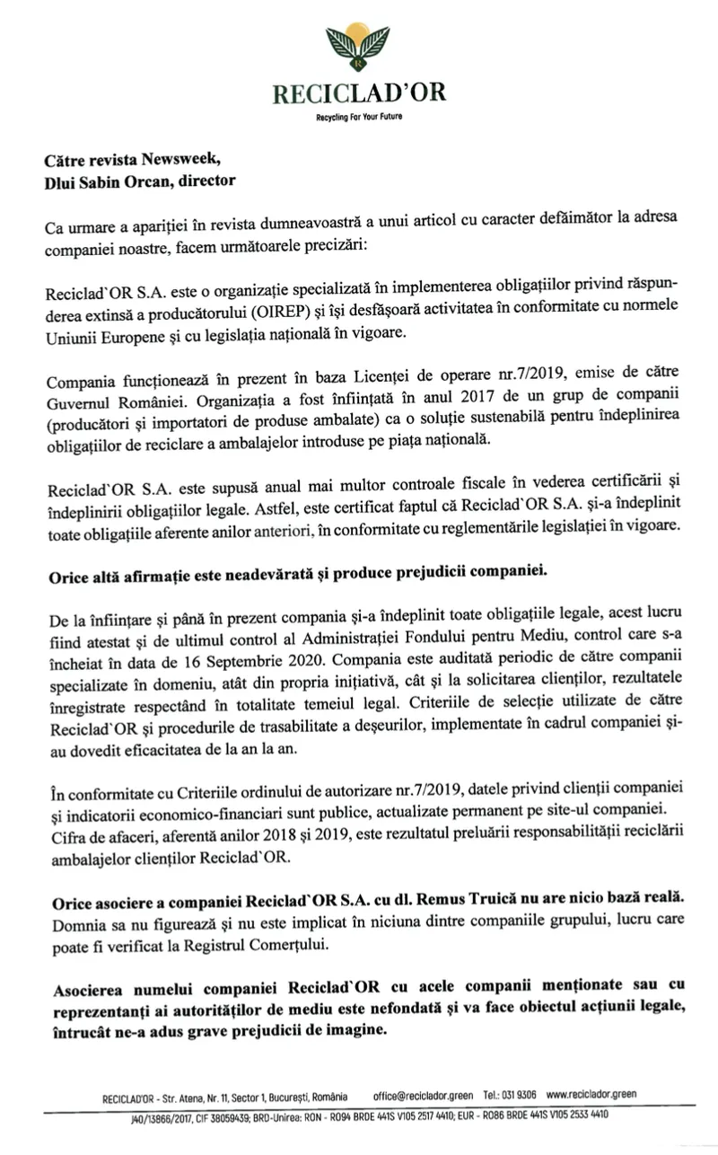Compania Recliclad'or, despre care anchetatorii susțin că este intermediar între generatorii de deșeuri și reciclatori, este condusă de Daniela Ionela Cîțu, concubine lui Remus Truică. Conform Registrului Comerțului, Reciclad'OR SA este deținută, la zi, de patru acționari: Klaus SRL, Unicom Production SRL Filiala Urlați, Maspex România SRL și Colect'or Glass SRL. Primii trei acționari au câte 1% fiecare. Majoritatea de 97% a acțiunilor este deținută de Colect’or Glass SRL, firmă cu sediul la aceeași adresă cu Reciclad’OR SA.