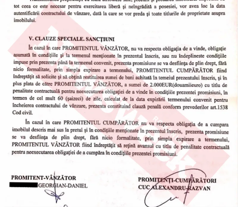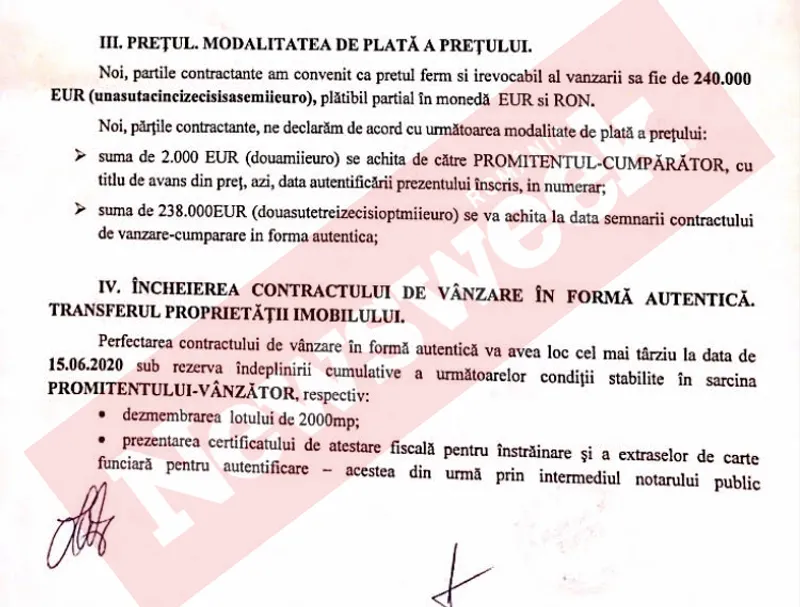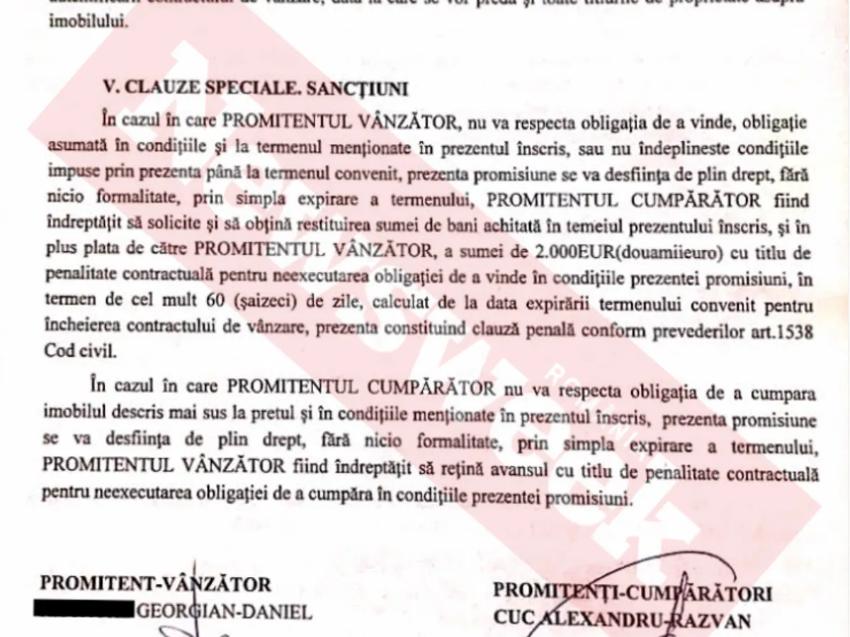 Prețul negociat a fost de 240.000 euro. După ce a semnat promisiunea de vânzare – cumpărare, Răzvan Cuc a plătit un avans de 2.000 euro.