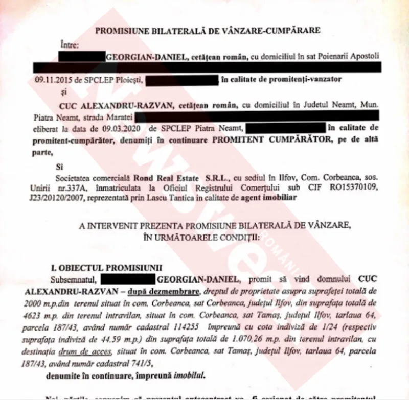 Cu gândul la fotoliul de primar al orașului Piatra Neamț, Răzvan Cuc a antamat un teren în comuna Corbeanca, din județul Ilfov. El a semnat o promisiune bilaterală de vânzare – cumpărare cu un prahovean, Georgian Daniel R. „Promit să vând domnului Cuc Răzvan Alexandru – după dezmembrare, dreptul de proprietate asupra suprafeței totale de 2000 m.p. din terenul situat în com. Corbeanca, sat Corbeanca, județul Ilfov”.