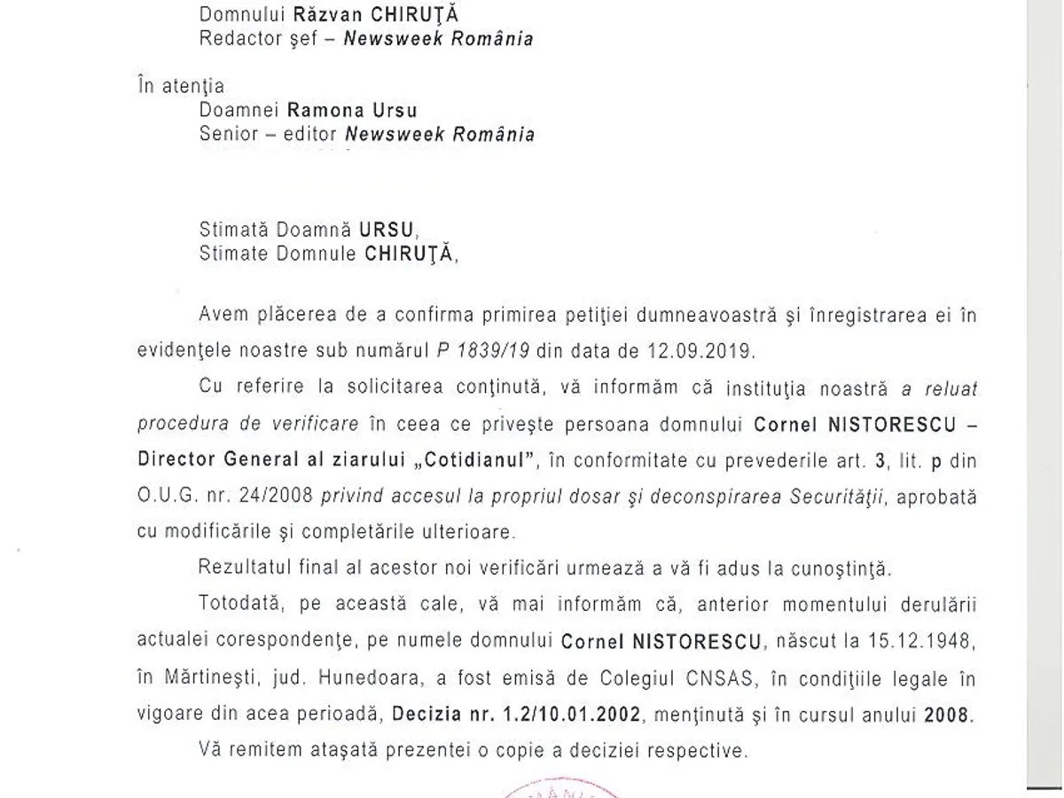 În 11 octombrie 2019, adică la o lună după solicitarea făcută de Newsweek România, CNSAS ne-a transmis un prim răspuns, prin care ne informa că „instituția noastră a reluat procedura de verificare în ceea ce privește persoana domnului Nistorescu Cornel, director general al ziarului Cotidianul, în conformitate cu prevederile art. 3, litera p din OUG nr. 24/2008 privind accesul la propriul dosar și deconspirarea Securității”.