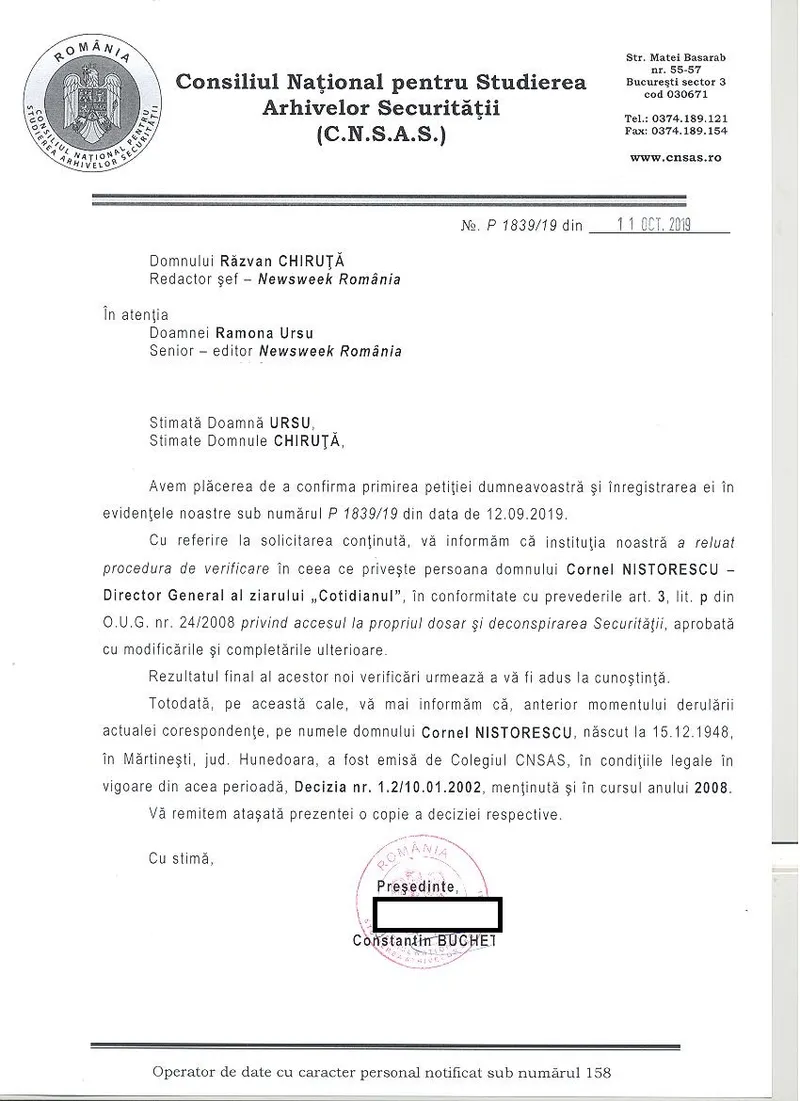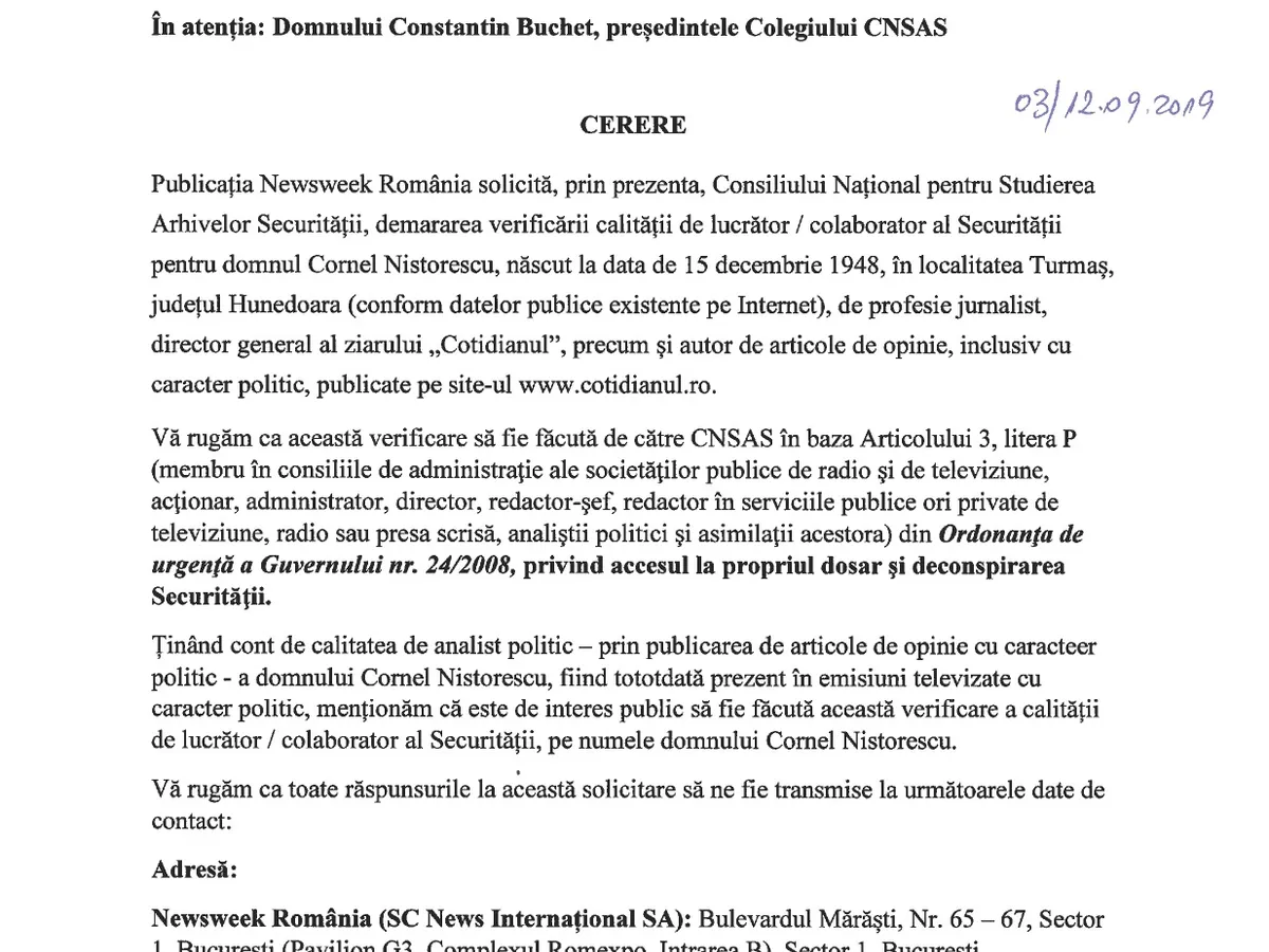 Consiliul Național pentru Studierea Arhivelor Securității (CNSAS) a emis o nouă adeverință privind relația cu fosta Securitate a jurnalistului Cornel Nistorescu, directorul general al publicației Cotidianul, ca urmare a cererii de reverificare făcute de către Newsweek România încă din septembrie 2019.