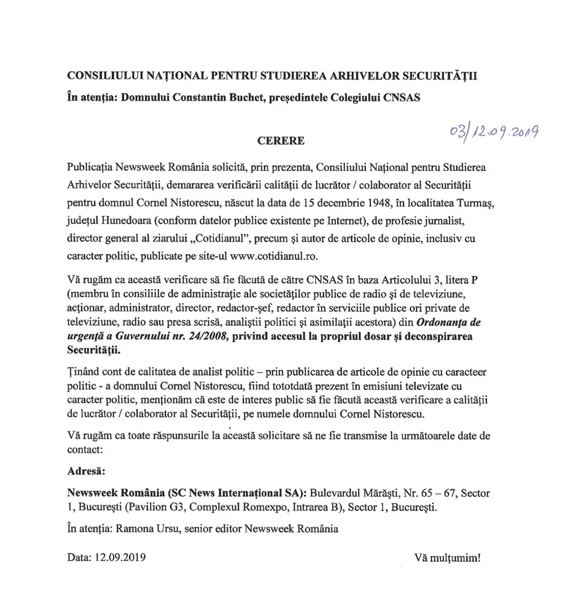- „Având în vedere cererea de verificare nr. P 1839/19/12.09.2019, adresată CNSAS de către d-na Ursu Ramona, jurnalist Newsweek România;