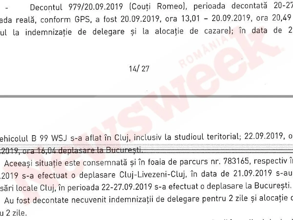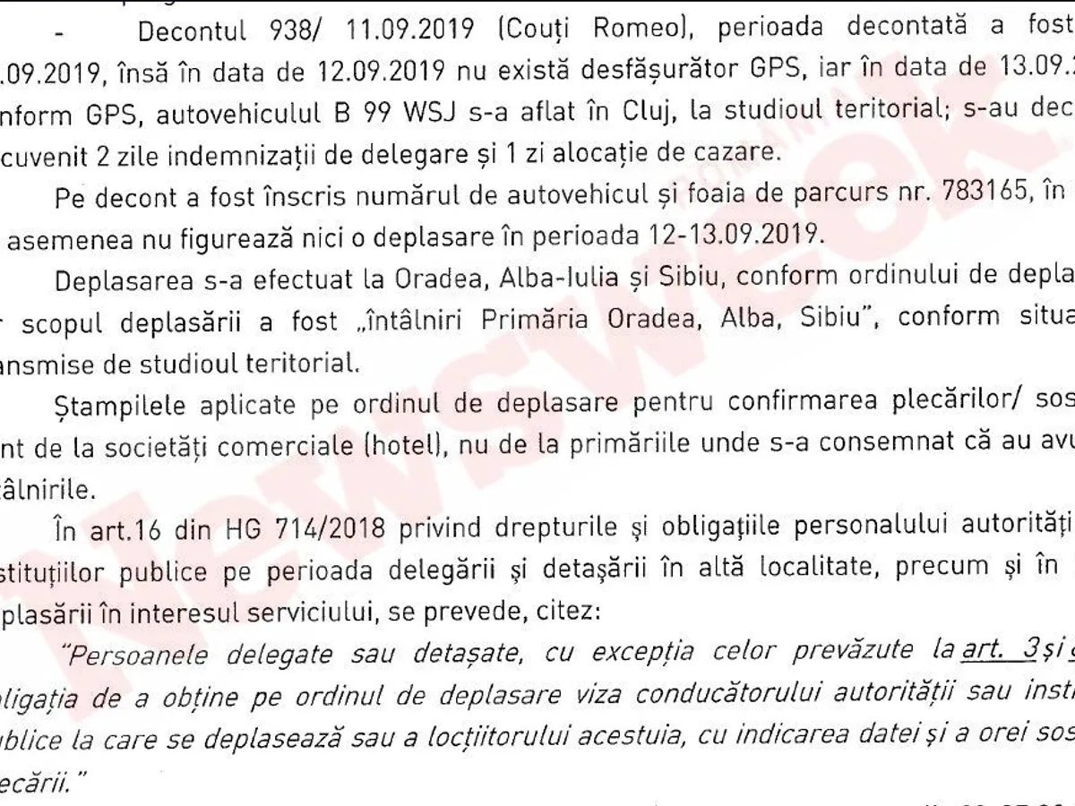„Pe decont a fost înscris numărul autovehiculului și foaia de parcurs în care nu figurează nici o deplasare în perioada 12-13.09.2019”. Conform ordinului de deplasare, deplasarea trebuia să se efectueze pe ruta Oradea – Alba Iulia – Sibiu iar scopul deplasării a fost „întâlniri Primăria Oradea, Alba, Sibiu”. Ștampilele aplicate pe ordinul de deplasare pentru confirmarea plecărilor/sosirilor sunt de la hotel, nu de la primăriile unde s-au consemnat întâlnirile.