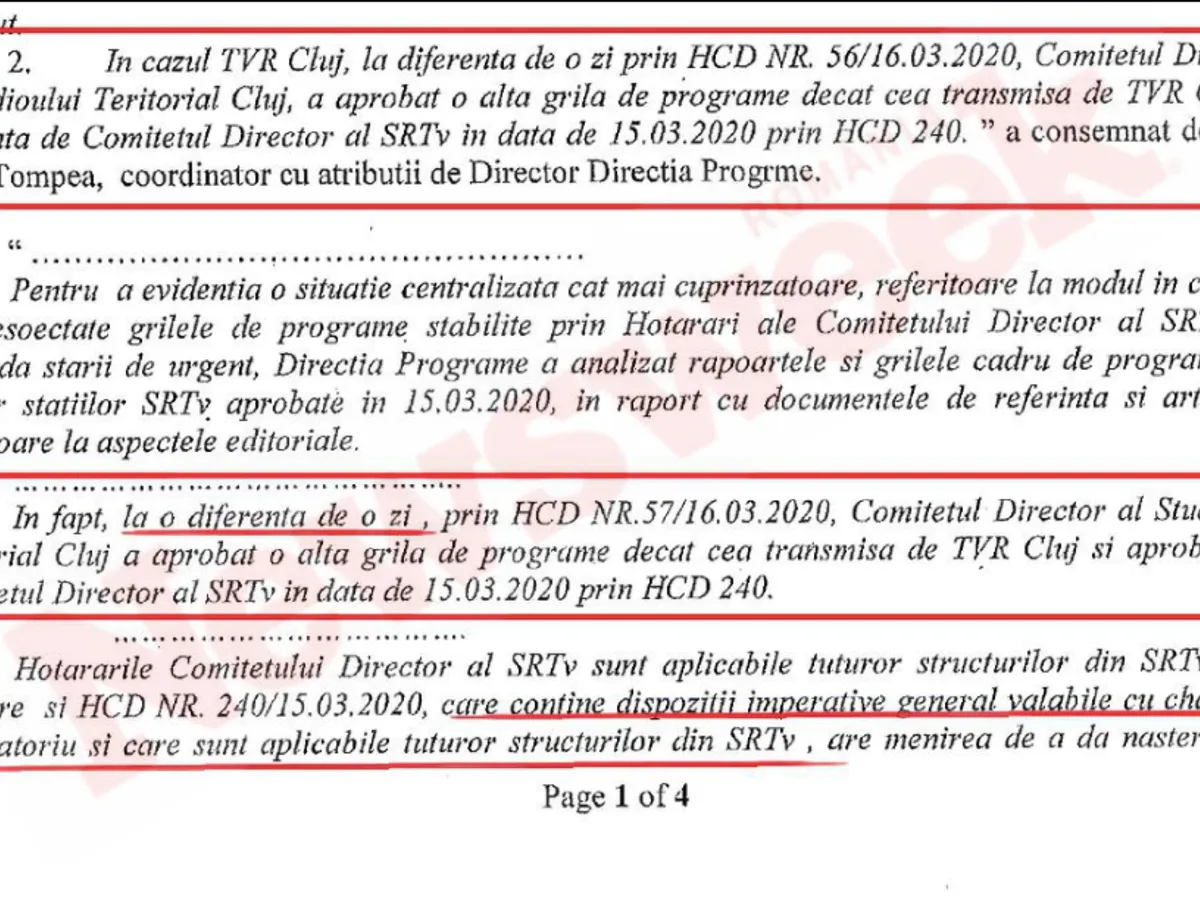Într-un raport al Direcției de Programe din cadrul TVR se menționează negru pe alb că „în fapt, la o diferență de o zi, prin HCD nr. 57/16.03.2020, Comitetul Director al Studioului Teritorial Cluj a aprobat o altă grilă de programe decât cea transmisă de TVR Cluj și aprobată de Comitetul Director al SRTv în data de 15.03.2020 prin HCD 240. Conform raportului, Hotărârile Comitetului Director sunt aplicabile tuturor structurilor din SRTv. Prin urmare și HCD nr. 240/15.03.2020, care conține dispoziții imperative general valabile cu caracter obligatoriu și care sunt aplicabile tuturor structurilor din SRTv, are menirea de a da naștere unor obligații clare și precise de la care subiecții de drept nu pot deroga”.