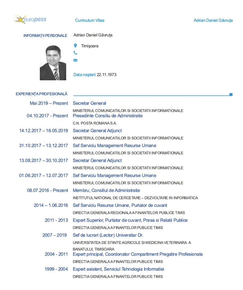 Conform CV-ului, Găvruța și-a început ascensiunea în administrația centrală în 2017, imediat ce PSD a preluat puterea. Astfel, a primit mai multe funcții în Ministerul Comunicațiilor și instituții conexe, precum Poșta Română.