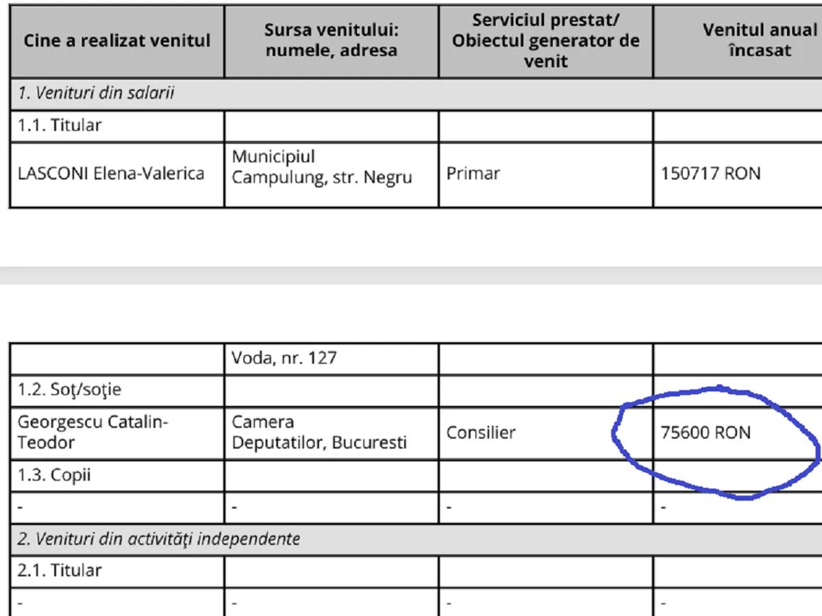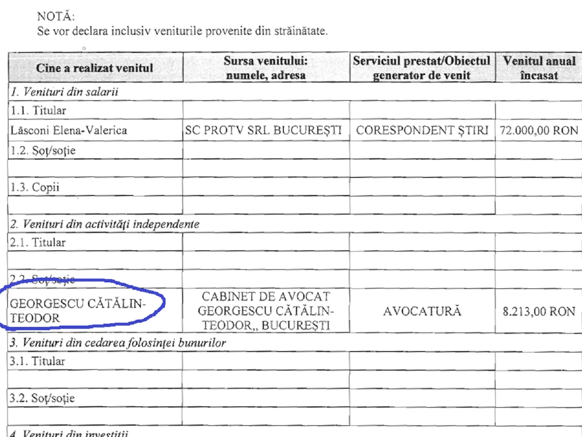 Potrivit declarației de avere depusă de Elena Lasconi, Georgescu a câștigat, în 2019, suma de 700 de lei pe lună ca avocat. Facsimil din declarația de avere din 2020 pe anul 2019 a doamnei Lasconi.