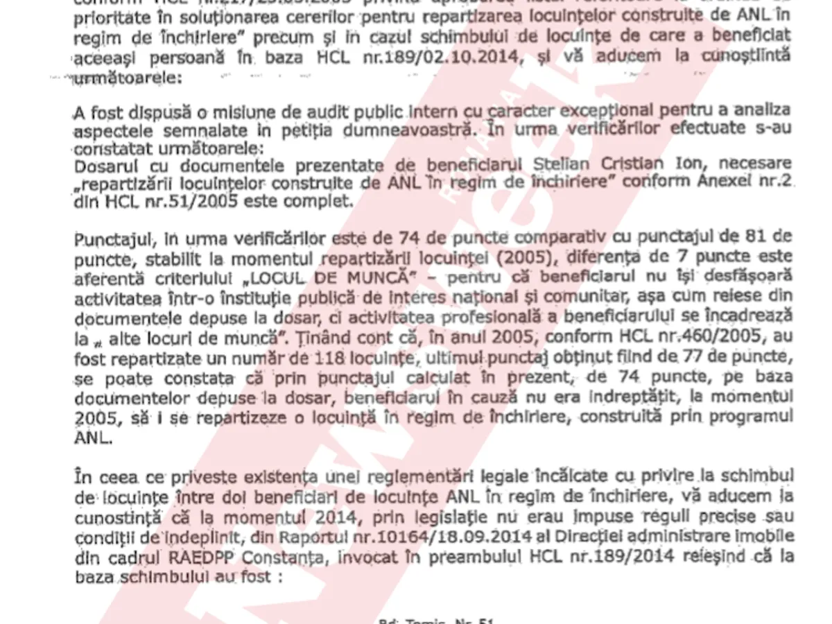Cel mai important pasaj din acest document este cel care confirmă că punctajul lui Stelian Ion a fost umflat prin fraudă: “A fost dispusă o misiune de audit public intern cu caracter excepțional pentru a analiza aspectele semnalate în petiția dumneavoastră. În urma verificărilor efectuate s-au constatat următoarele: (...) Punctajul, în urma verificărilor este de 74 de puncte comparativ cu punctajul de 81 de puncte, stabilit la momentul repartizării locuinței (2005), diferența de 7 puncte este aferentă criteriului