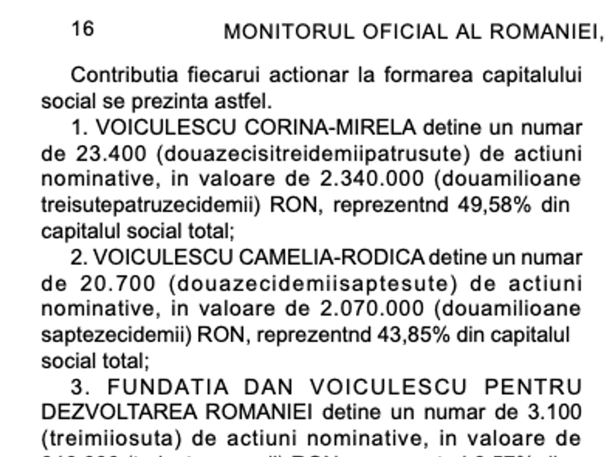 Iar prețul nu a fost mic, arată aceeași sursă: "FUNDATIA DAN VOICULESCU PENTRU DEZVOLTAREA ROMANIEI detine un numar de 3.100 (treimiiosuta) de actiuni nominative, in valoare de 310.000 (treisutezecemii) RON, reprezentnd 6,57% din capitalul social total". Așadar, 310.000 lei, dintr-un foc.