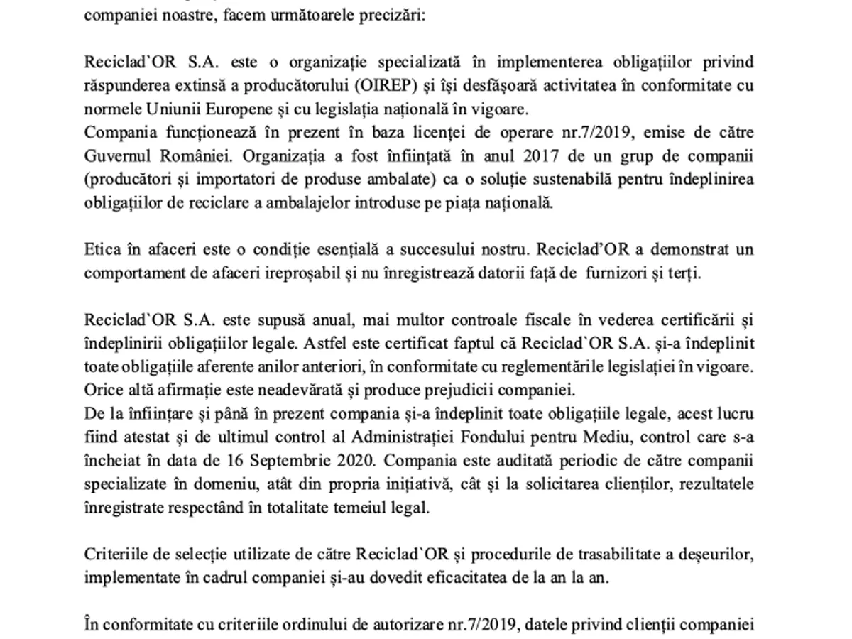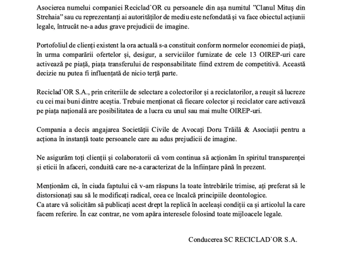 În urma publicării articolului, Reciclad'Or a trimis un drept la replică. Integral, dreptul la replică poate fi citit mai jos.