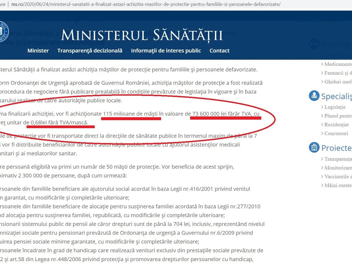 73,6 milioane de lei va plăti Ministerul Sănătății pentru achiziționarea a 115 milioane de măști de protecție pentru a fi distribuite gratuit persoanelor defavorizate. Contractul este încheiat cu un afacerist care nu a fost ocolit de scandaluri.
